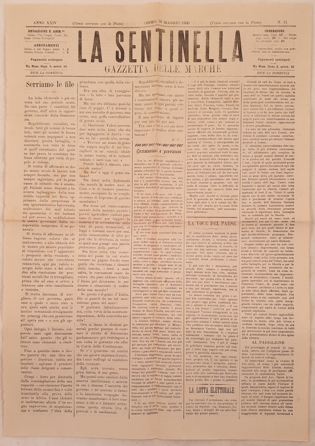 LA SENTINELLA GAZZETTA DELLE MARCHE ANNO XXIV OSIMO 29 MAGGIO 1900