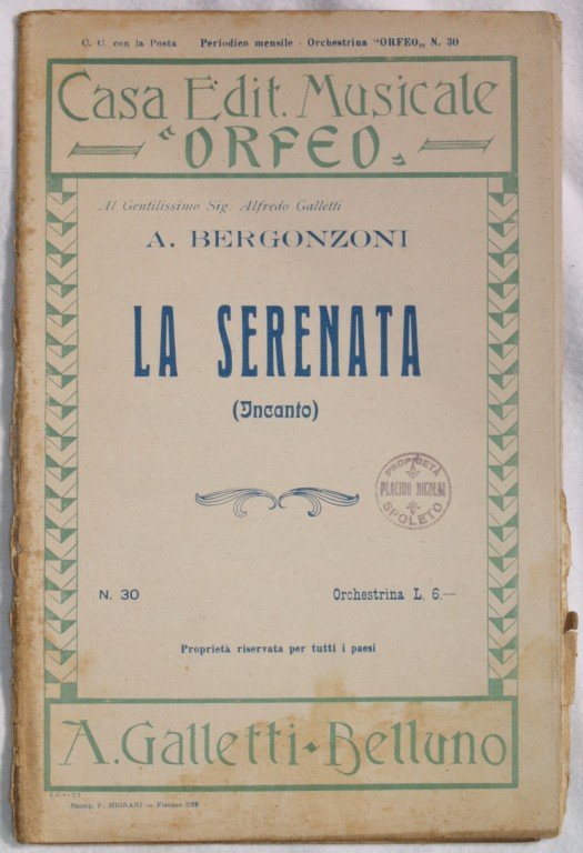 In 8. cm 27x17,5. Pp. 16. Partitura completa per orchestra del 1928 di una canzone. Caratteristica copertina decorata dell'epoca. Ex libris sulla copertina. Discrete condizioni; dorso e qualche margine usurato. A complete score for orchestra of 1928. Carachteristic decorated cover of that period. Ex libris in the cover. Fair conditions; worn size and worn edges of pages.