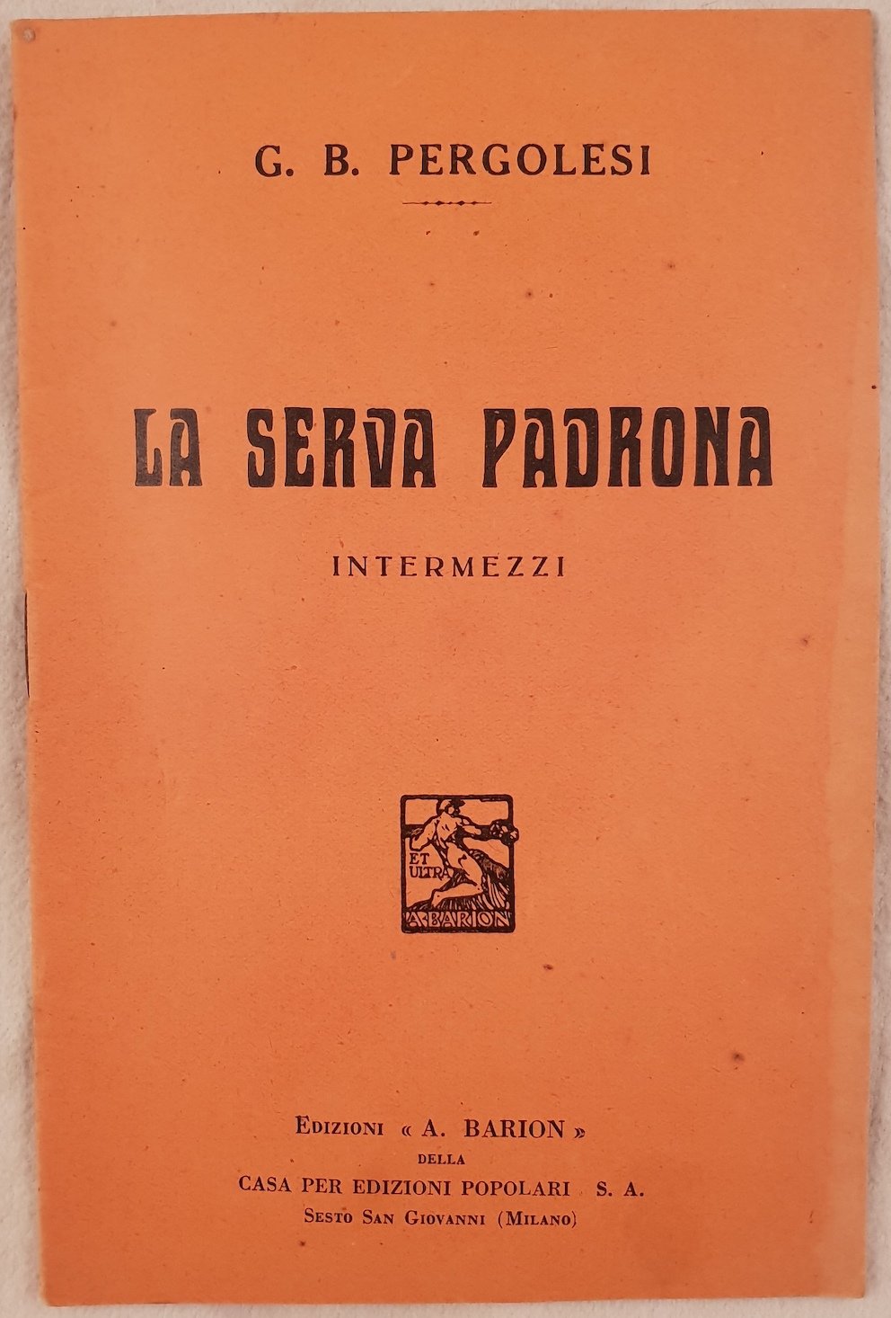 Bel libretto d'opera del 1935 dell'intermezzo "La serva padrona" di Giovanni Battista Pergolesi (1710-1736). La prima rappresentazione ebbe luogo al Teatro san Bartolomeo di Napoli il 28 Agosto 1733. In buone condizioni. Brossura editoriale in buone condizioni generali con lievi usure ai margini e dorso. Legatura in buone condizioni. All'interno le pagine si presentano in ottime condizioni con rare fioriture. In 8. Dim. 18,5x12 cm. Pp. 16. Beautiful booklet of the work "La serva padrona" by Giovanni Battista Pergolesi (1710-1736) on booklet by Gennaro Antonio Federico. Not dated but of the first years of 1900. The first representation took place in the Teatro San Bartolomeo in Naples the 28th of August 1733. In good conditions. Editorial cover in good general conditions slightly worn in the edges and spine. Binding in good conditions. Inside pages are in very good conditions with occasional foxings.