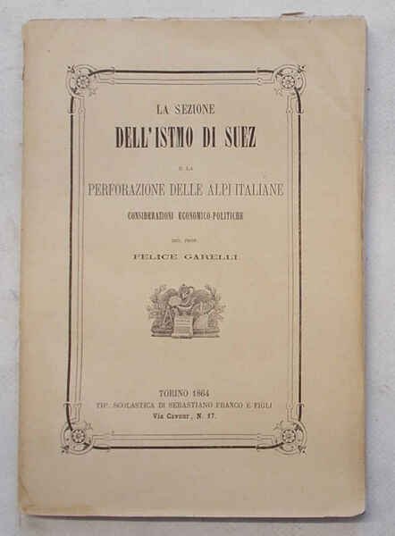 In 8° (cm. 22 x 15); pagg. 164; brossura originale con cornice tipograf. VG. ** La prima parte è dedicata al progetto, all'esecuzione e ai vantaggi del "bosforo di Suez". La seconda alla "Perforazione delle Alpi Italiane": progetto del traforo delle Alpi, esecuzione del tunnel Cenisio, progetto di perforazione delle Alpi Centrali, vantaggi delle opere di Suez e delle Alpi per l'Italia.