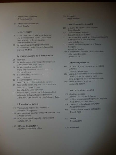 DESCRIZIONE: Electa Napoli 2005, br. ed. ca. ill., pp. 429 ill. b/n e col. n.t. in 4°. Presentazione del volume curato da Ennio Cascetta, assessore ai trasporti della Regione Campania, che fa il punto aggiornato sul 'laboratorio Campania', un'esperienza esemplare destinata a cambiare radicalmente la qualità dello sviluppo. La Campania sta assistendo negli ultimi anni ad una trasformazione profonda del sistema dei trasporti locali: dall'istituzione di servizi innovativi, a partire dal sistema di tariffe e titoli di viaggio unificati per treni e autobus, alla costruzione e al potenziamento, soprattutto, di nuove linee metropolitane, stazioni ferroviarie, porti, aeroporti, interporti, strade, parcheggi e nodi di interscambio. CONDIZIONI: Ottime/Perfette. PESO / WEIGHT: 2581 gr. without package