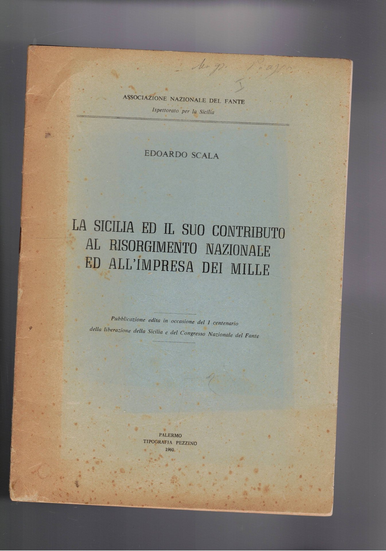 La Sicilia ed il suo contributo al Risorgimento Nazionale ed all'impresa dei Mille. Estratto in occasione ddel I° centenario della liberazione della Sicilia e del congresso nazionale del fante.