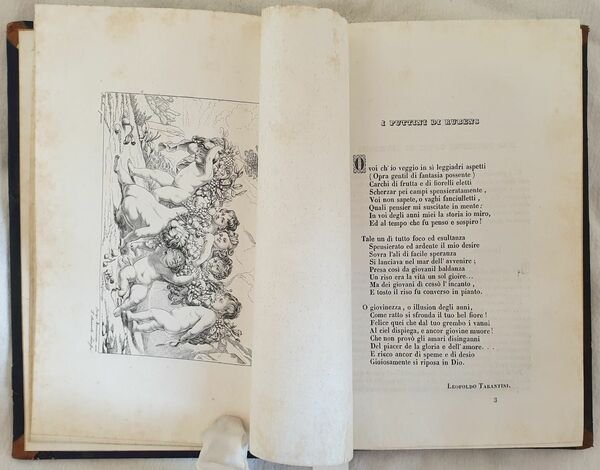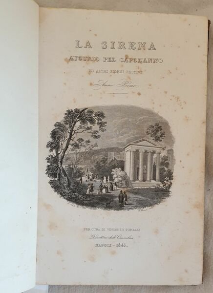 Elegante strenna augurio per il capodanno per l'anno 1845 a cura di Vincenzo Torelli. All'interno alcuni articoli: Il Tempio di Virgilio nella Villa Reale, Alcune celebrità in Pompei, Sulla edizione illustrata dei Promessi sposi di Manzoni, Del vandalismo, Storia dei doni che si fanno a capo d'anno, San Francesco di Paola, Le nozze di Costanza d'Avalos e Federico del Balzo nel secolo XV, Il sepolcreto magico, Uno sguardo a Londra, Vaticinio di Cassandra, Ruggiero a Mileto la caccia, L'angelo di Giugliano, Una notte sul Terminio, Sonetti (A tre città italiane: Ferrara, Bologna, San Benedetto di Ascoli) e lettere di vari autori, , ecc. Il testo è impreziosito da sei incisioni: Il Tempio di Virgilio nella Villa Reale, Puttini di Rubens, Il santuario di San Francesco di Paola, Vittorio Alfieri, Il Capitano Cook, una bella veduta animata della processione con l'Angelo a Giguliano. In ottime condizioni. Copertina in mezza pelle coeva con titolo e decorazioni in oro al dorso in ottime condizioni generali con lievi usure ai margini e dorso. Legatura in buone condizioni. Pagine in ottime condizioni con rare fioriture. In 8. cm 21,5x15. Pp. (6)+184Elegant almanach for the beginning of the year 1845 by Vincenzo Torelli. Some articles inside: the Temple of Virgil in Villa Reale, Some celebrities in Pompei, About the illustrated edition of Promessi sposi of Manzoni, About vandalism, History fot he gifts of the Beginning of the year, San Francesco di Paola, the marriage of Costanza d'Avalos and Federico del Balzo during XV century, the magic grave, London, Vaticinio di Cassandra, Ruggiero a Mileto lthe hunting, The angel of Giugliano, A night onl Terminio, Sonnets (To three italian cities: Ferrara, Bologna, San Benedetto di Ascoli) lettersof different authors, ecc. The text is enriched by six plates: The temple of Virgil in Villa Reale, Putti in Rubens, The sanctuary of San Francesco di Paola, Vittorio Alfieri, The Captain Cook, an animated view of procession of Angel in Giguliano. In very good conditions. Half leather coeval cover in very good conditions lightly worn in the extremities. Binding in good conditions. Pages in very good conditions with occasional foxing. In 8. cm 21,5x15. Pp. (6)+184