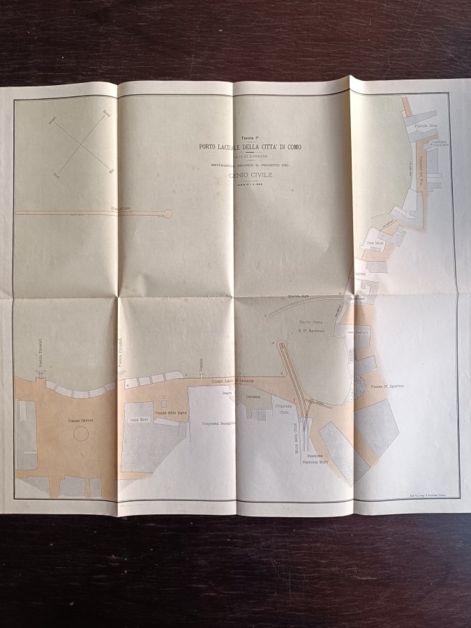 In-8° (cm. 24,5), brossura editoriale a stampa con titolo in nero al piatto anteriore (lievi fioriture, tracce d'usura al dorso, disgiunta); pp. 19 [1b] in stato molto buono (leggere fioriture sparse); con 2 grandi carte di planimetrie a colori più volte ripiegate fuori testo. Rara edizione di questo opuscolo con proposte dell'ingegnere Enrico Rossetti per un nuovo progetto portuale di Como. Esemplare molto buono. (SJ