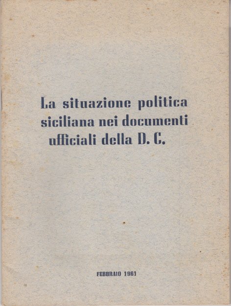 In-8 (Cm 21 x 15,8), pp.48, brossura editoriale. Relazione del segretario regionale onorevole D'Angelo al comitato regionale del 6-7 Febbraio 1961. Leggera ingilalitura alla brossura, lieve brunitura margine delle pagine.