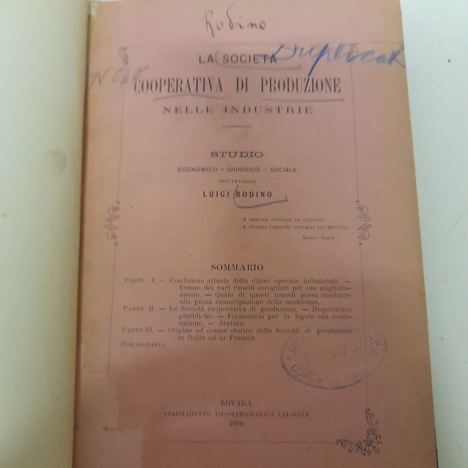 Studio Economico Giuridico Sociale dell'Avvocato Luigi Rodino. Volume in 8° Legatura in mezza pelle con titoli in oro sul dorso.All'interno è conservata la copertina originale. Legatura salda,pagine sane.COMPLETO