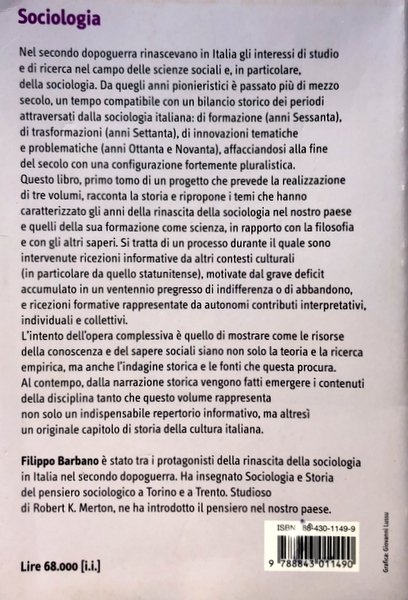 Nel secondo dopoguerra rinascevano in Italia gli interessi di studio e di ricerca nel campo delle scienze sociali e, in particolare, della sociologia. Da quegli anni pionieristici è passato più di mezzo secolo, un tempo compatibile con un bilancio storico dei periodi attraversati dalla sociologia italiana: di formazione (anni Sessanta), di trasformazioni (anni Settanta), di innovazioni tematiche e problematiche (anni Ottanta e Novanta), affacciandosi alla fine del secolo con una configurazione fortemente pluralistica. Questo libro, primo tomo di un progetto che prevede la realizzazione di tre volumi, racconta la storia e ripropone i temi che hanno caratterizzato gli anni della rinascita della sociologia nel nostro paese e quelli della sua formazione come scienza, in rapporto con la filosofia e con gli altri saperi. Si tratta di un processo durante il quale sono intervenute ricezioni informative da altri contesti culturali (in particolare da quello statunitense), motivate dal grave deficit accumulato in un ventennio pregresso di indifferenza o di abbandono, e ricezioni formative rappresentate da autonomi contributi interpretativi,