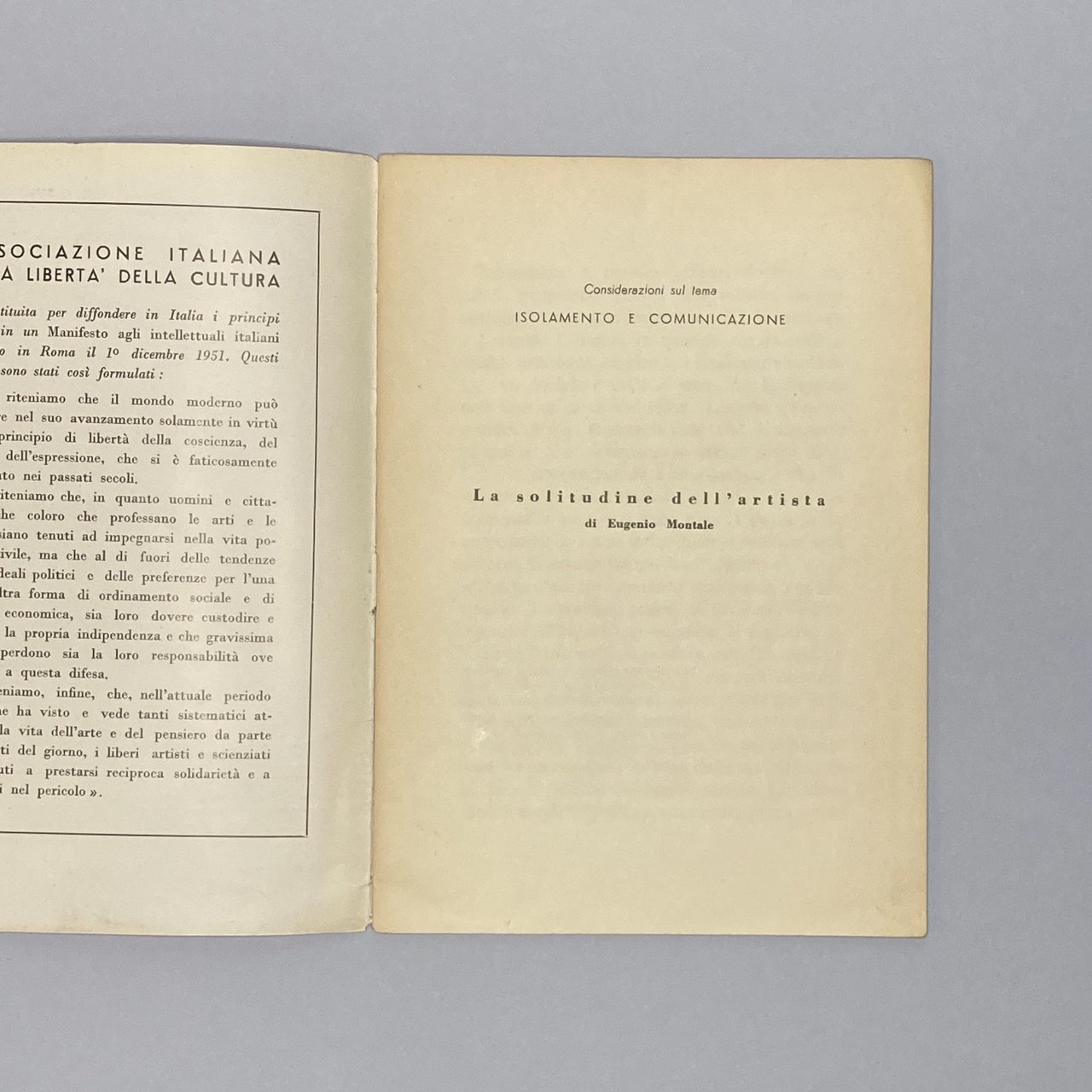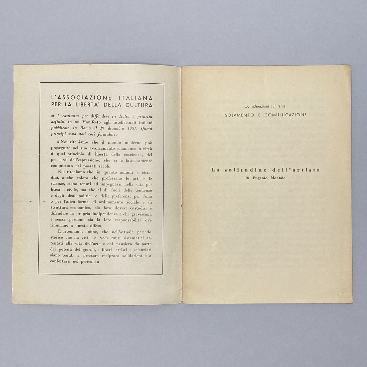 16°, cm 18, pp. 24, brossura spillata, copertina a due colori. Contiene la conferenza tenuta in francese sul tema Isolamento e Comunicazione, tradotta dall'autore in italiano. Primo libro di prosa pubblicato da Montale. Problemi del Nostro Tempo, n. 7. Impercettibili segni al dorso, al piatto posteriore qualche sigla in matita agli angoli, peraltro eccellente conservazione.. *** TUTTI I NOSTRI LIBRI SONO VISIBILI PREVIO CONTATTO MAIL O TELEFONO NELLA NUOVA SEDE DI MILANO: LIBRERIA COSMOPOLIS, VIA JOMMELLI, 22. ***