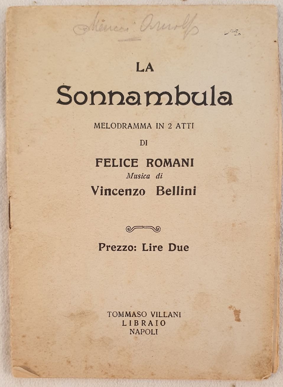 Bel libretto d'opera degli anni '30 dell'opera in due atti "La sonnambula" del compositore italiano Vincenzo Bellini (1801-1835) su libretto di Felice Romani.<BR>La prima rappresentazione ebbe luogo al Teatro Carcano di Milano il 6 marzo 1831.<BR>In discrete condizioni. Brossura editoriale in buone condizioni generali con lievi usure ai margini e dorso. Legatura quasi assente. All'interno le pagine si presentano in ottime condizioni con rare fioriture. In 8. Dim. 19x13,5 cm. Pp. 24. Beautiful booklet of 1930's of the work in two acts "La sonnambula" by the italian composer Vincenzo Bellini (1801-1835) on booklet by Felice Romani. The first representation took place in the Teatro Carcano of Milan the 6th of March 1831. In fair conditions. Editorial cover in good general conditions slightly worn in the edges. Binding is almost missing. Inside pages are in very good conditions with occasional foxings. In 8. Dim. 19x13,5 cm. Pp. 24.
