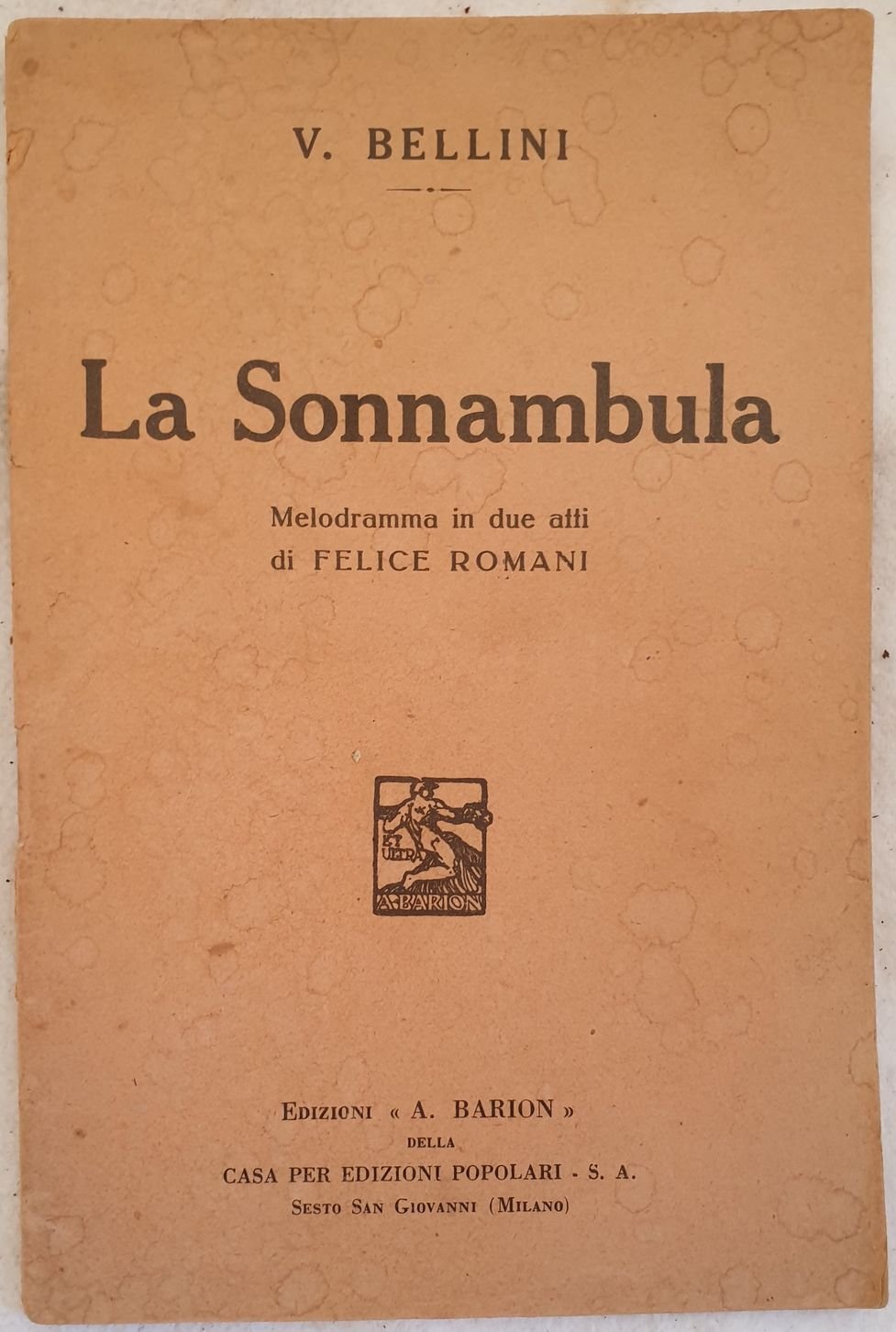 Bel libretto d'opera del 1934 dell'opera in due atti "La sonnambula" del compositore italiano Vincenzo Bellini (1801-1835) su libretto di Felice Romani. La prima rappresentazione ebbe luogo al Teatro Carcano di Milano il 6 marzo 1831.<BR>In buone condizioni. Brossura editoriale in buone condizioni generali con lievi usure ai margini e dorso. Legatura in buone condizioni. All'interno le pagine si presentano in ottime condizioni con rare fioriture. In 16. Dim. 18,5x12 cm. Pp. 32. Booklet of 1934 of the work "La sonnambula" by Vincenzo Bellini (1801-1835) on booklet by Felice Romani The first representation took place the 6th of march 1831 in Theatre Carcano in Milan. In good conditions. Editorial cover in good general conditions slightly worn in the edges and spine. Binding in good conditions. Inside pages are in very good conditions with foxings. In 16. Dim. 18,5x12 cm. Pp. 32.