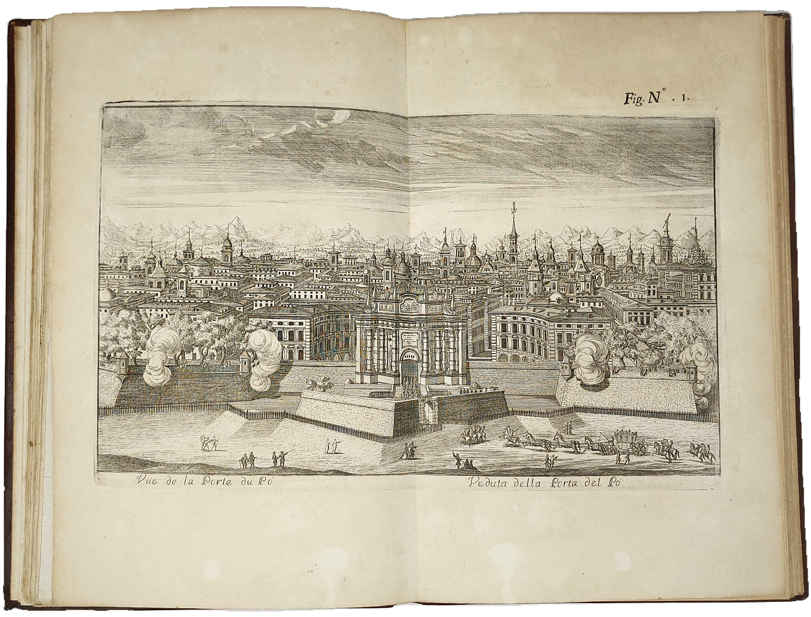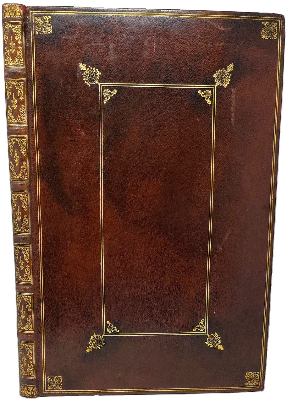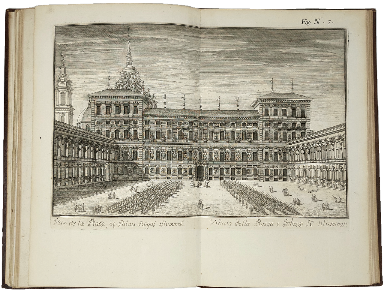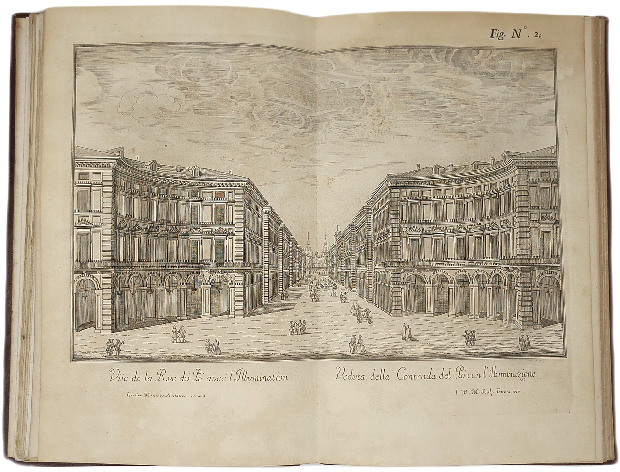 >in-folio (mm 366x235), pp. XXVII (testo italiano), XVIII (testo francese). Splendida ed elegante legatura in piena pelle ad imitazione “alla Du Seuil“, fregi oro ai piatti, nervi e ricche decorazioni in oro entro scomparti al dorso. Volume illustrato da un antiporta inciso con le grandi armi di Savoia e di Lorena, e da 14 tavole a doppia pagina, disegnate e incise in rame da vari artisti (Vittone, Masson, Agliaudi, Daudet, Belmondo, de Prenner, Herriset) raffiguranti stupende vedute di Torino «illuminata» per il festoso sposalizio (Veduta della Porta del Po; Contrada del Po; Castello Reale verso la strada del Po, Macchina de Fuochi di Gioia, Facciata e laterali del Castello dalla parte della Dora, Veduta geometrica del Padiglione Reale, Piazza e Palazzo Reale; Piazza San Carlo; Palazzo di Città, Chiesa del Corpus Domini; Il Ghetto; Esposizione della Sindone; Vigna della Regina; Giardino della Venaria Reale). E' il più bel libro torinese di feste; pregiatissimo e non comune. Piccoli restauri al margine bianco dell'antiporta e al frontespizio; qualche macchietta rossa ad alcune tavole. Per il resto ottimo esemplare. Cicognara, 1504 ; Vinet, 600 ; Peyrot, I, 151 ; Ruggieri, 848 ; Watanabe, 1545.
