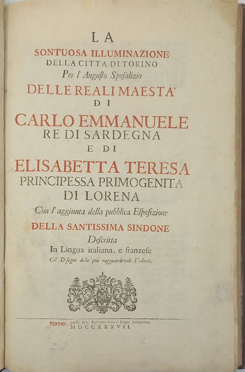 La Sontuosa Illuminazione della cittá di Torino per l'Augusto Sposalizio delle Reali Maesta' di Carlo Emmanuele Re di Sardegna et di Elisabetta Teresa Principessa Primogenita di Lorena. Con l'aggiunta della publica...Esposizione della Santissima Sindone.