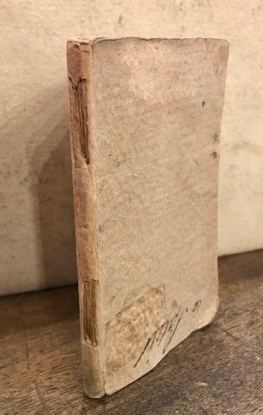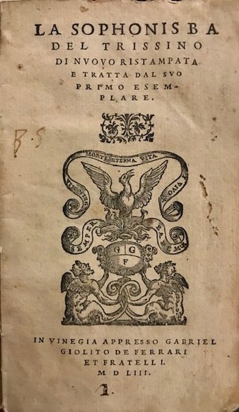 12mo (cm. 12,7), 37 cc., 1 c.nn. Marca tipografica al frontespizio ed al verso dell’ultima carta. Capilettera figurati n.t. Legatura antica in cartoncino alla rustica con cuciture a vista al ds. (un’antica firmetta al piatto anteriore). Alcuni trascurabili forellini al frontespizio, altrimenti esemplare in ottimo stato di conservazione. Edizione rara. Allacci, 727; Bongi (I, pp. 406-407): ‘Semplice ma assai elegante ristampa delle edizioni fatte dall’autore in Roma ed in Vicenza, colla stessa sua dedica originale a papa Leone. Nella bottega giolitina si riprodusse di nuovo la Sofonisba nel 1562 e nel 1585’.