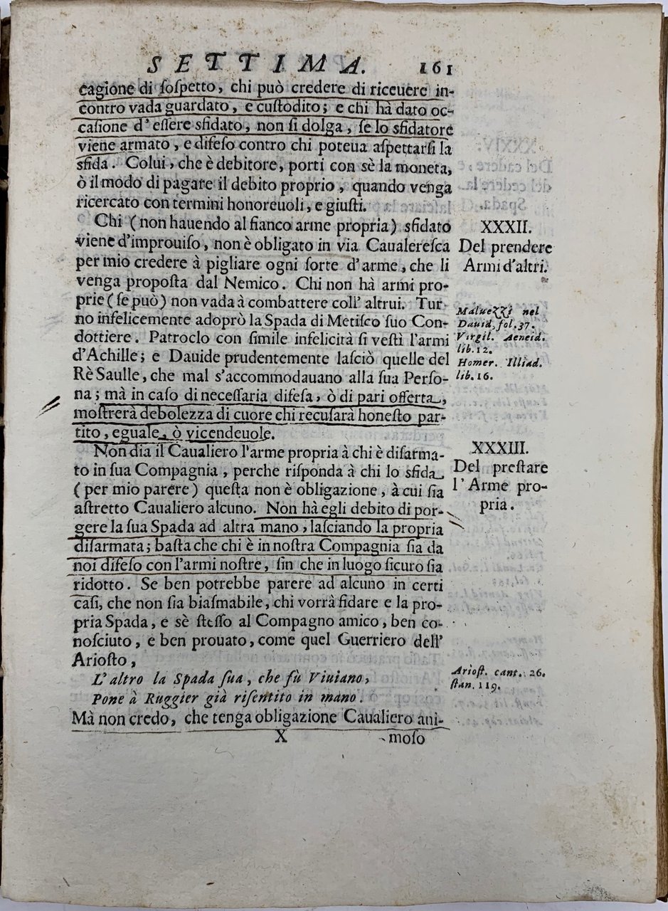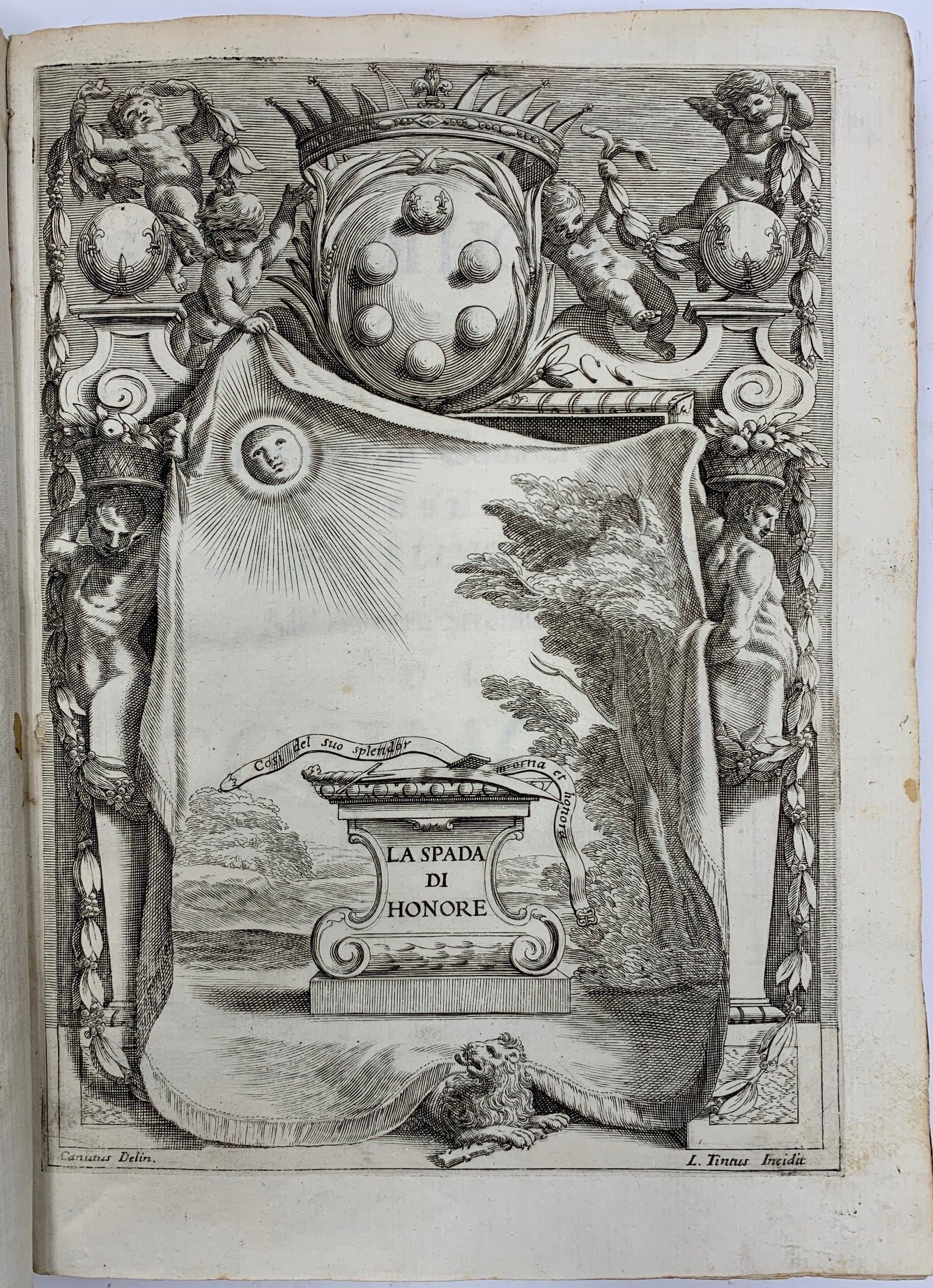 >In-4 (mm 230 x 165), pp. (40),188, (36); legatura in pergamena molle, titolo manoscritto al dorso. Edizione originale uscita contemporaneamente all'edizione in-12. Adorna di occhietto, antiporta figurato con le armi di Cosimo III di Toscana, ritratto del Gessi entro elaborata cornice con leoni, libri e spade, e 10 finissime tavole f.t. Si tratta delle stesse dieci lastre utilizzate per l'edizione in-12, qui arricchite da una bordura ornamentale. Le 10 tavole illustrano versi del Tasso, del Guarini, sentenze di Orazio, Seneca e Platone; il tutto inciso in rame da L. Tinti dai disegni di Domenico Maria Canuti, allievo di Guido Reni. In fine la marca tipografica “all' Insegna delle due Rose”. Opera morale, divisa in otto parti, sui doveri dei cavalieri, ''un vero e proprio codice dell'onore'' (Gelli, p. 195); essa inoltre riguarda gli emblemi e può anche annoverarsi tra i libri di scherma, essendo raffigurata la spada in alcune incisioni. Buon esemplare con numerose sottolineature coeve, piccole arrossature nel margine superiore bianco di alcuni fogli. Al contropiatto superiore ex libris “Giuseppe di Gio. Agostino Giacomelli”. Cat. Libr. Vinciana, n. 297. Olschki Choix, 10111. Michel-Michel, IV, 36
