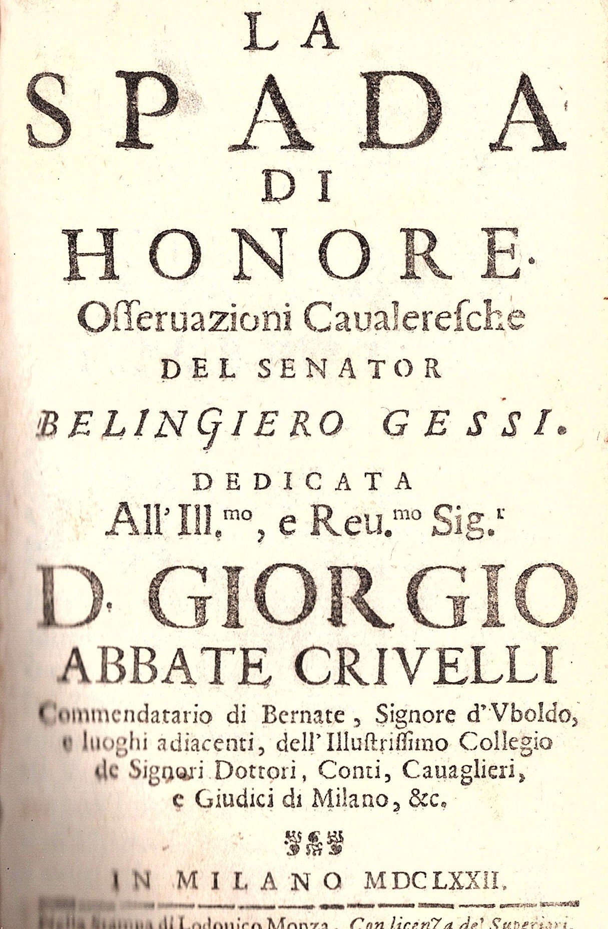 La Spada di Honore. Osservazioni Cavaleresche. Dedicata all'Ill.mo, e Rev.mo Sig.r D. Giorgio Abbate Crivelli Commendatario di Bernate, Signore d'Uboldo, e luoghi adiacenti, dell'Illustrissimo Collegio de Signori Dottori, Conti, Cavaglieri, e Giudici di Milano, &c.