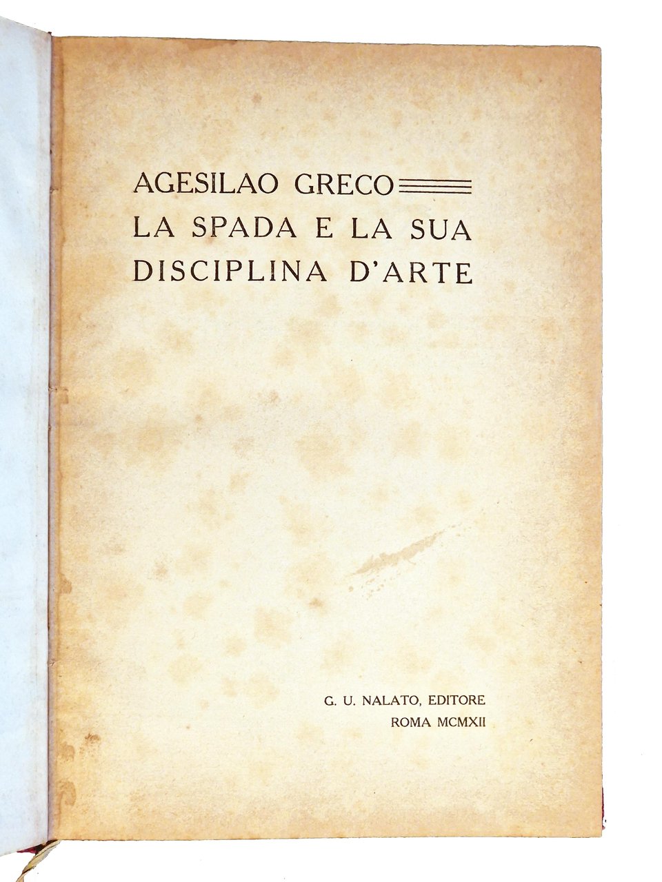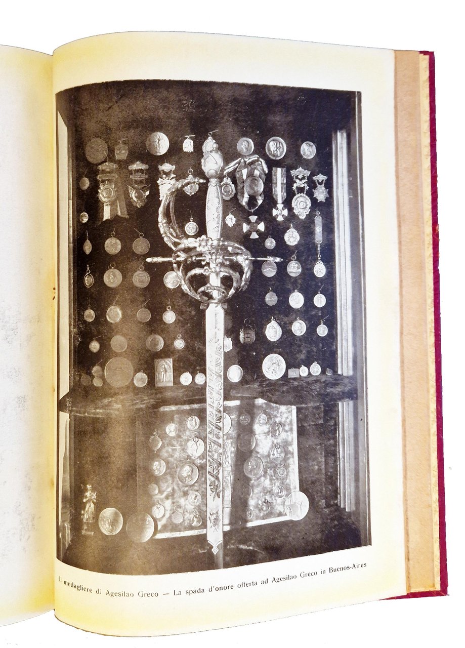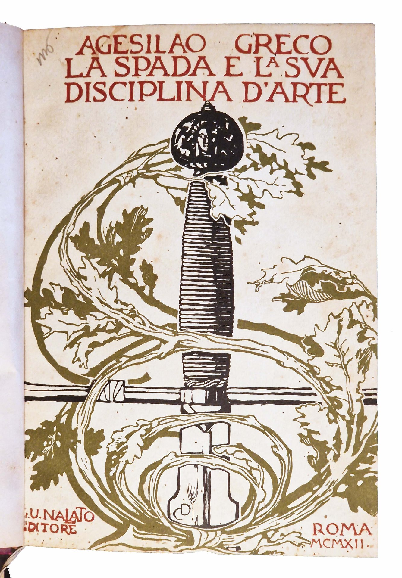 Un volume (246x170 mm); leg. in cartonato rosso, con titolo dorato al dorso, guardie a disegni floreali, copertina anteriore della brosssura editoriale illustrata (con disegno raffigurante l'impugnatura di una spada, in nero e verde, e titolo in rosso); pp. (4), XII, 148, (8) (1 foglio di errata) più 38 carte di tavole fotografiche f.t. in b/n ; testatine e fregi xilografici in sanguigna disegnati appositamente a tema schermistico da Duilio Cambellotti (autore anche del disegno della copertina). Prima ed unica edizione, esemplare n. 378, con firma dell'Autore, Agesilao Greco (Caltagirone 17 gennaio 1866 – Roma 17 ottobre 1963, grande schermidore italiano, oltre che teorico e didatta della scherma, autore di diversi trattati). Rif.: IT\ICCU\IEI\0144654. OCLC, 889439711. Cond.: Leggere fioriture e bruniture marginali alle carte, ma ottimo esemplare.