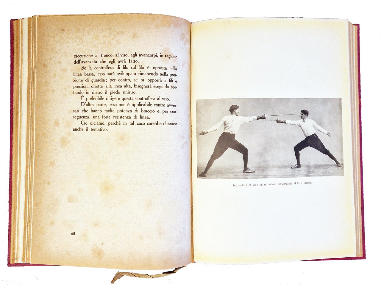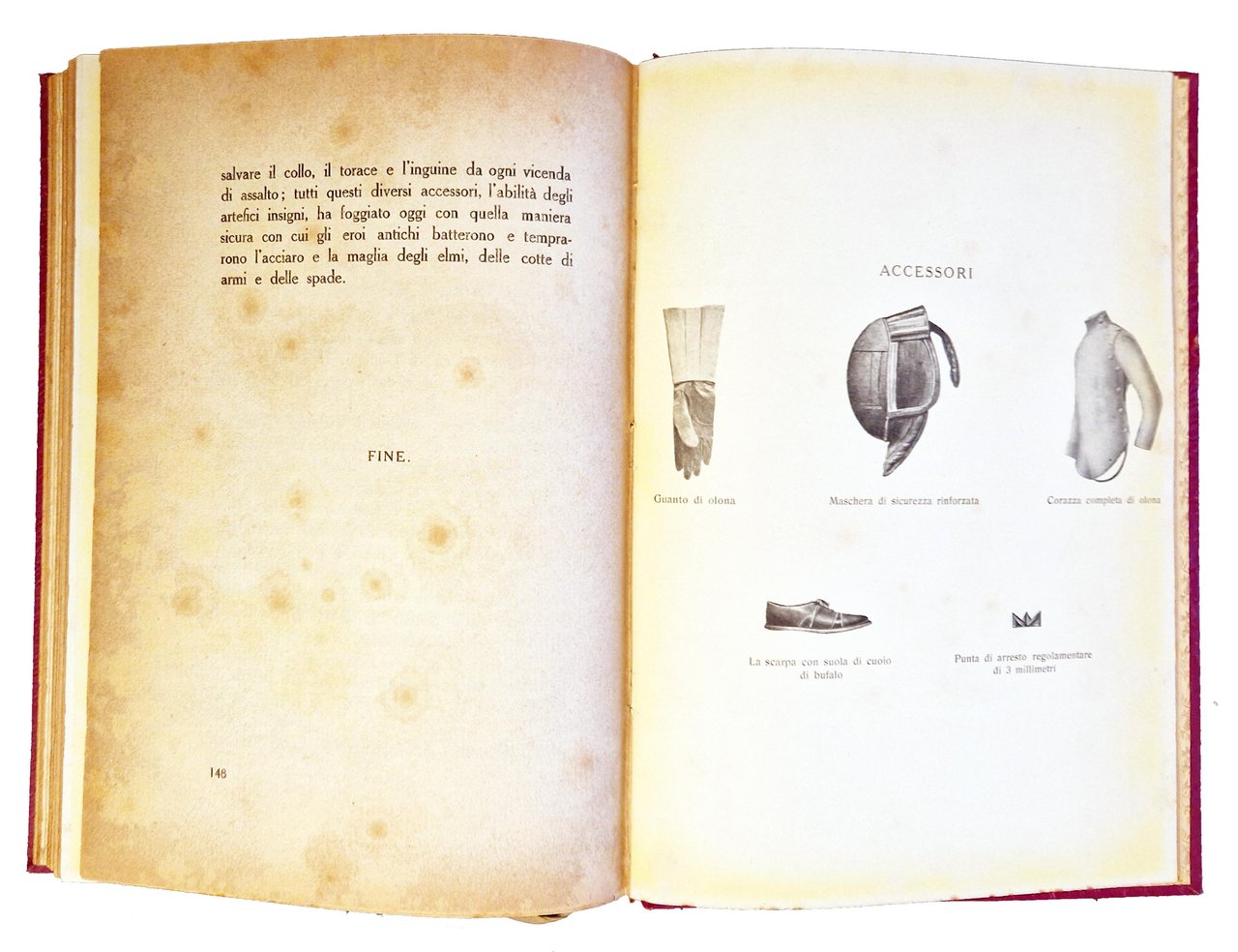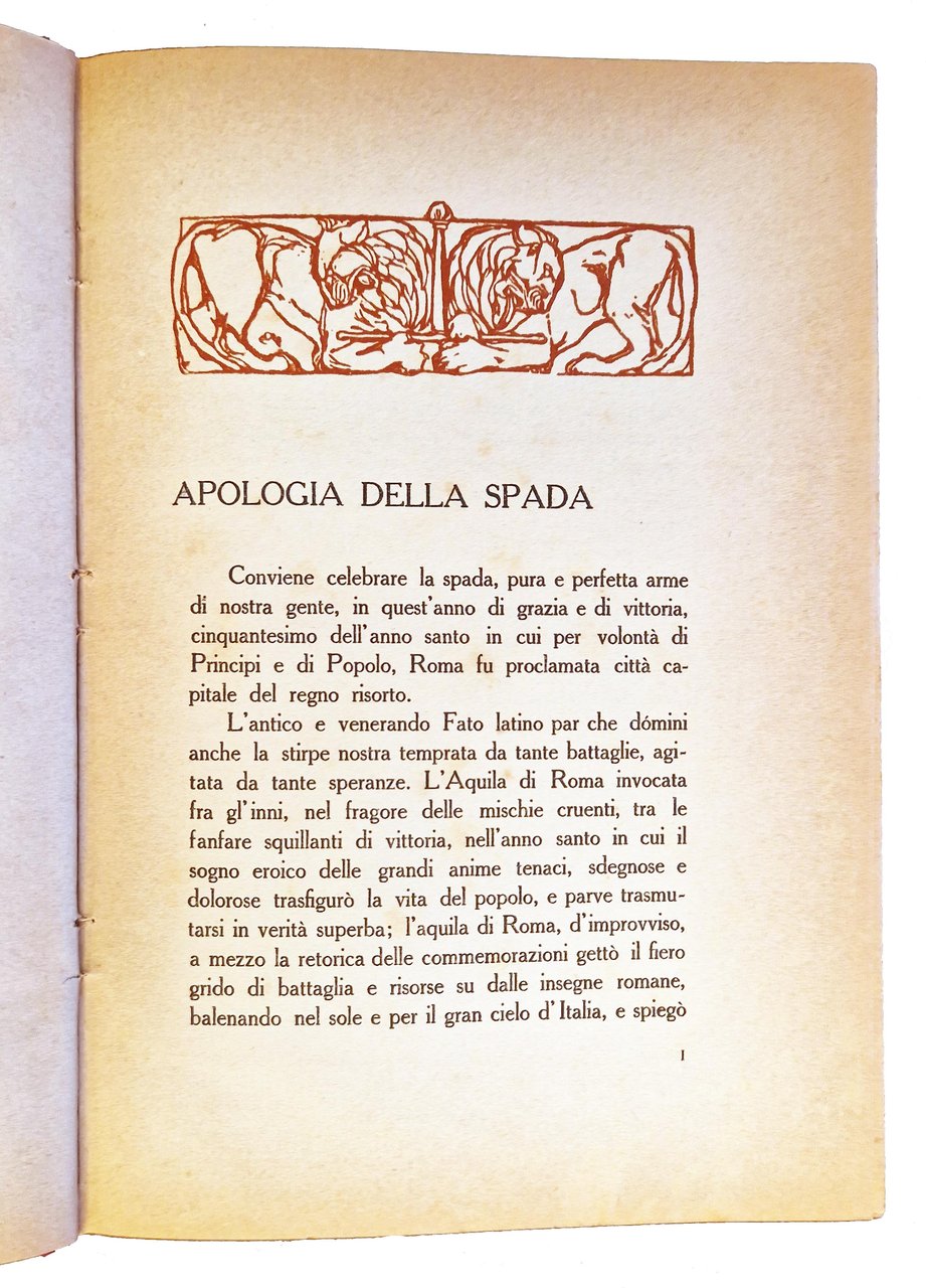 Un volume (246x170 mm); leg. in cartonato rosso, con titolo dorato al dorso, guardie a disegni floreali, copertina anteriore della brosssura editoriale illustrata (con disegno raffigurante l'impugnatura di una spada, in nero e verde, e titolo in rosso); pp. (4), XII, 148, (8) (1 foglio di errata) più 38 carte di tavole fotografiche f.t. in b/n ; testatine e fregi xilografici in sanguigna disegnati appositamente a tema schermistico da Duilio Cambellotti (autore anche del disegno della copertina). Prima ed unica edizione, esemplare n. 378, con firma dell'Autore, Agesilao Greco (Caltagirone 17 gennaio 1866 – Roma 17 ottobre 1963, grande schermidore italiano, oltre che teorico e didatta della scherma, autore di diversi trattati). Rif.: IT\ICCU\IEI\0144654. OCLC, 889439711. Cond.: Leggere fioriture e bruniture marginali alle carte, ma ottimo esemplare.