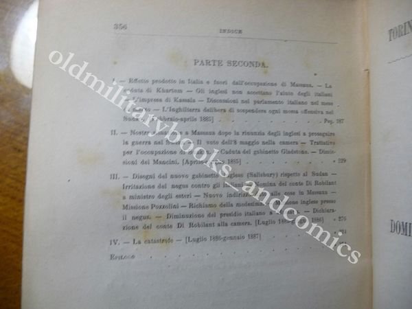 DESCRIZIONE: L. Roux e C. Editori Torino-Napoli 1888, br. ed. con rilegatura d'epoca tit. in oro al dorso pp. 356 in 8°. Gli inizi della nostra avventura coloniale in Africa, dall'acquisto di Assab al tragico combattimento di Dogali. Indice completo in foto. CONDIZIONI: Buone, come detto rilegatura d'epoca e tracce di fox all'interno. PESO / WEIGHT: 587 gr. without package