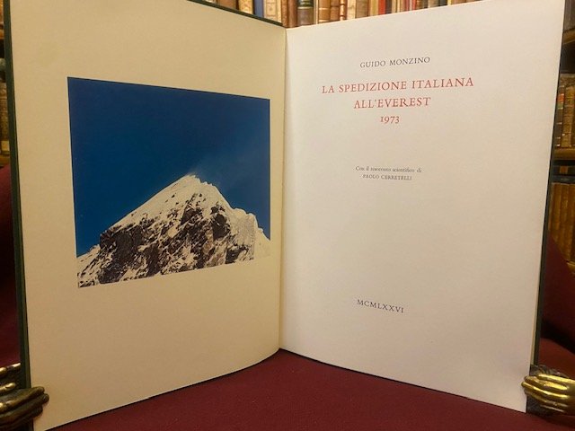 Legatura editoriale in tutta tela verde con titoli in oro su tassello rosso al dorso. Con 22 allegati di panorami, schemi, carte. Con XXIII tavole fotografiche a colori fuori testo raffiguranti il percorso di spedizione all'Everest, e altre figure in nero nel testo. Esemplare perfetto, nel cofanetto muto rigido editoriale. Sc. U.