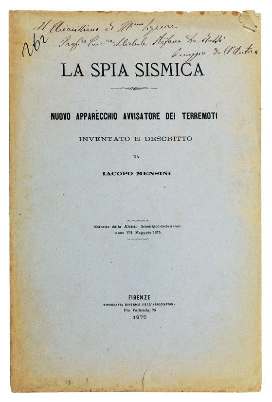 Offprint from: Rivista Scientifico-Industriale, vii (1875). The copy send by Mensini to the well-known seismologist De Rossi.
