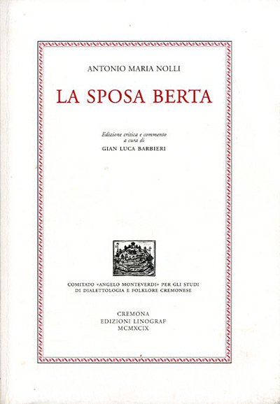 XLVIII, 180 p. ; 24 x 17 cm. «La sposa Berta» è una comedia in lingua vernacula cremonese composta da Antonio Maria Nolli nel 1794. La vicenda narrata in questa commedia ha come protagonisti i ceti popolari di Cremona, e ruota intorno ad un matrimonio contrastato. Le madri dei fidanzati vi si oppongono, i padri vi acconsetono e, d'accordo con i figli innamorati, si sforzano di combattere la testardaggine delle donne che non vogliono senire ragioni. Edizione critica e commento a cura di Gian Luca Barbieri. Sul front. : Comitato "Angelo Monteverdi" per gli studi di dialettologia e folklore cremonese. Brossura editoriale, coperta in cartoncino flessibile. Codice libreria 2203.