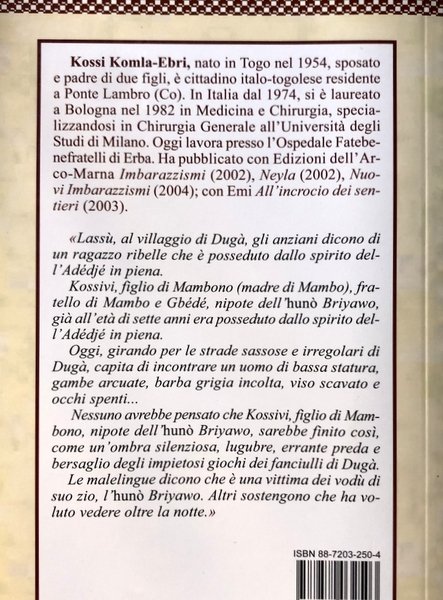 Kossi Komla-Ebri, il più “lombardo” tra i nuovi autori africani, ci fa riflettere e commuovere. Ci parla di partenze e di ritorni, di assimilazione e di identità culturale, ma lo fa lasciando libero spazio alla creatività racchiusa nel bagaglio personale di tutti i migranti. Kossi Komla-Ebri, nato in Togo nel 1954, sposato e padre di due figli, è cittadino italo-togolese residente a Ponte Lambro (Co).