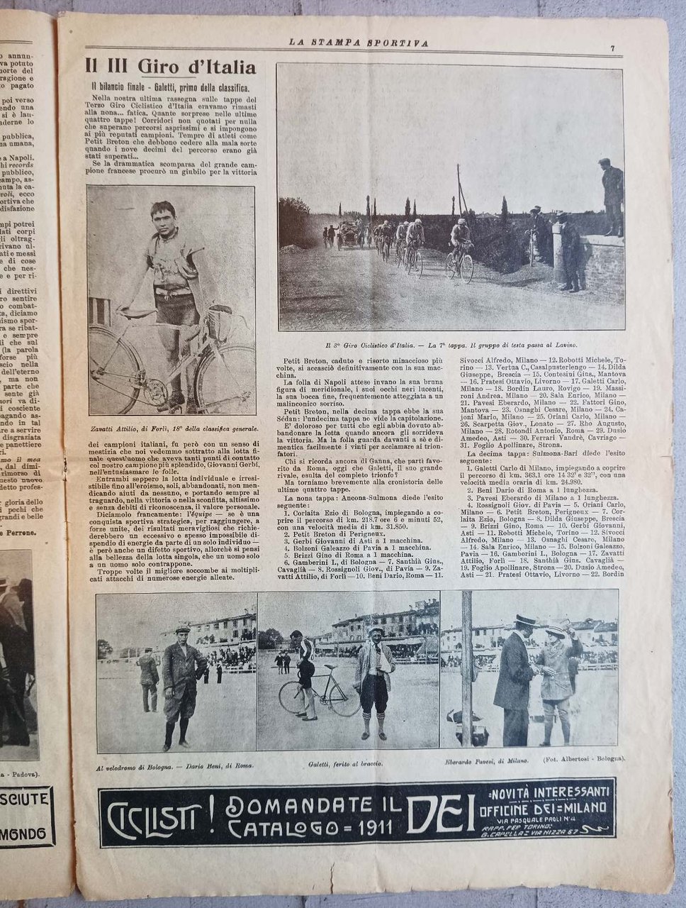>Numero singolo; rivista sportiva (mm 375 x 260), pp. 20. Supplemento sportivo settimanale illustrato del quotidiano La Stampa. In questo numero, il resoconto del raid aereo Parigi-Nizza-Roma (28 maggio/ 3 giugno 1911) riporta una curiosità accaduta ad un concorrente francese: un pilota, in cerca di olio di ricino, utile alla lubrificazione del motore, si recò da un farmacista per acquistarne venti litri, sentendosi risopondere: "Venti litri? Ma lei signore è un pazzo...Già, è un aviatore! Mi rincresce, ma senza la ricetta d'un dottore io non posso assolutamente darle un purgante così forte". E così fu che l'aviatore perdette mezza giornata nella sperduta campagna romana. Interessante spaccato della vita sportiva italiana nei primi anni del XX secolo, con foto delle competizioni, degli atleti e pubblicità di prodotti, icone dell'industria italiana. Esemplare in buono stato di conservazione.