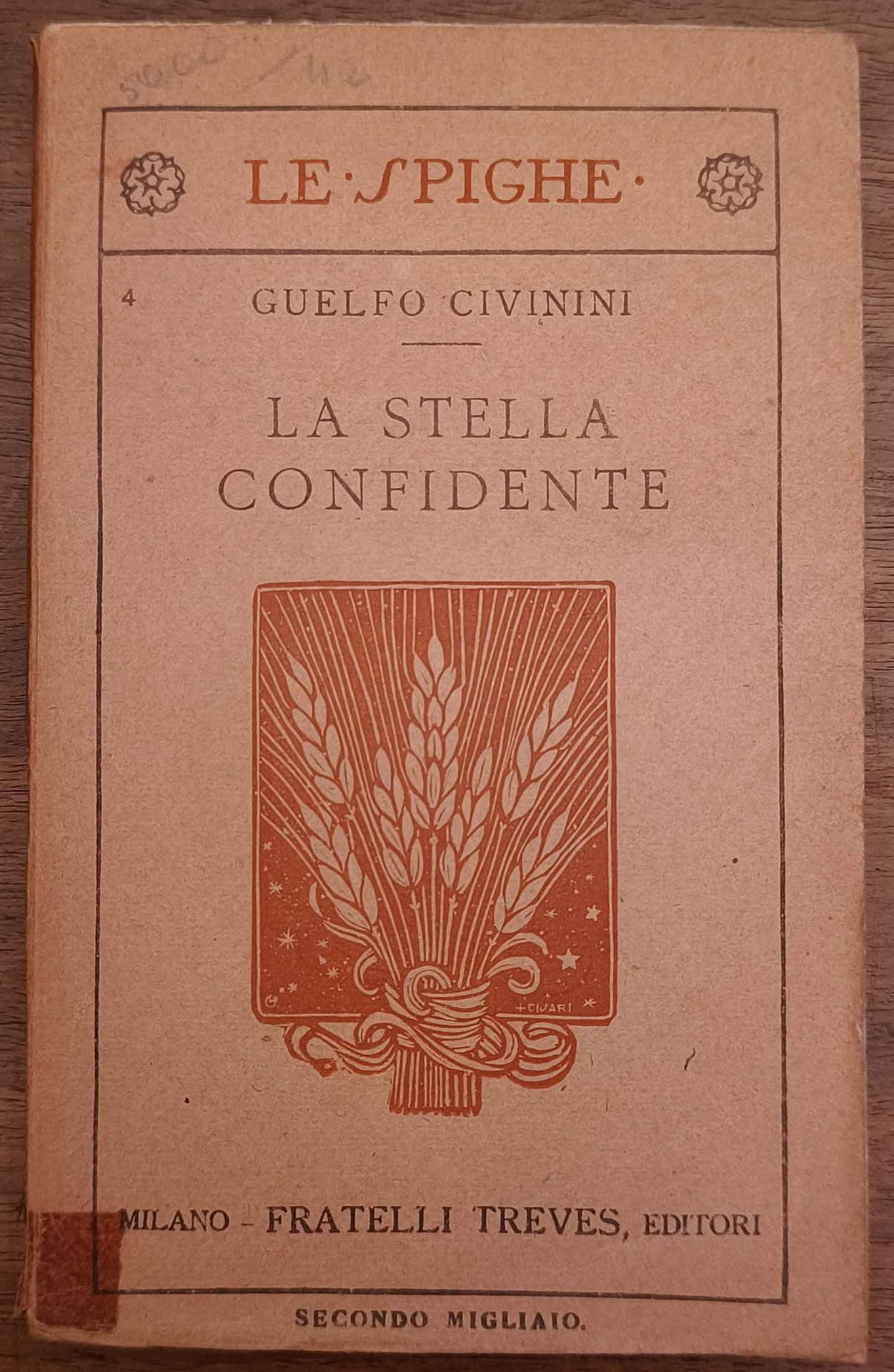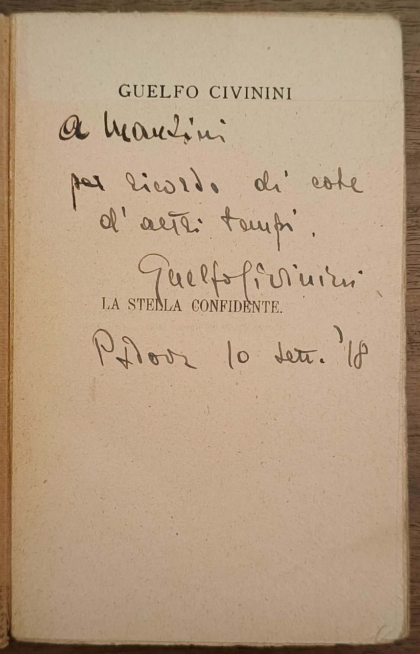 La stella confidente. Novelle, Milano, Treves, 1918. Prima edizione. Cm 16,6. Pp. 196. Brossura editoriale. Al dorso qualche strappo e segno di nastro adesivo. Mancanza alla prima carta che non compromette né testo né dedica. Dedica autografa dell'autore datata settembre '18 "a Manzini per ricordo di cose d'altri tempi".