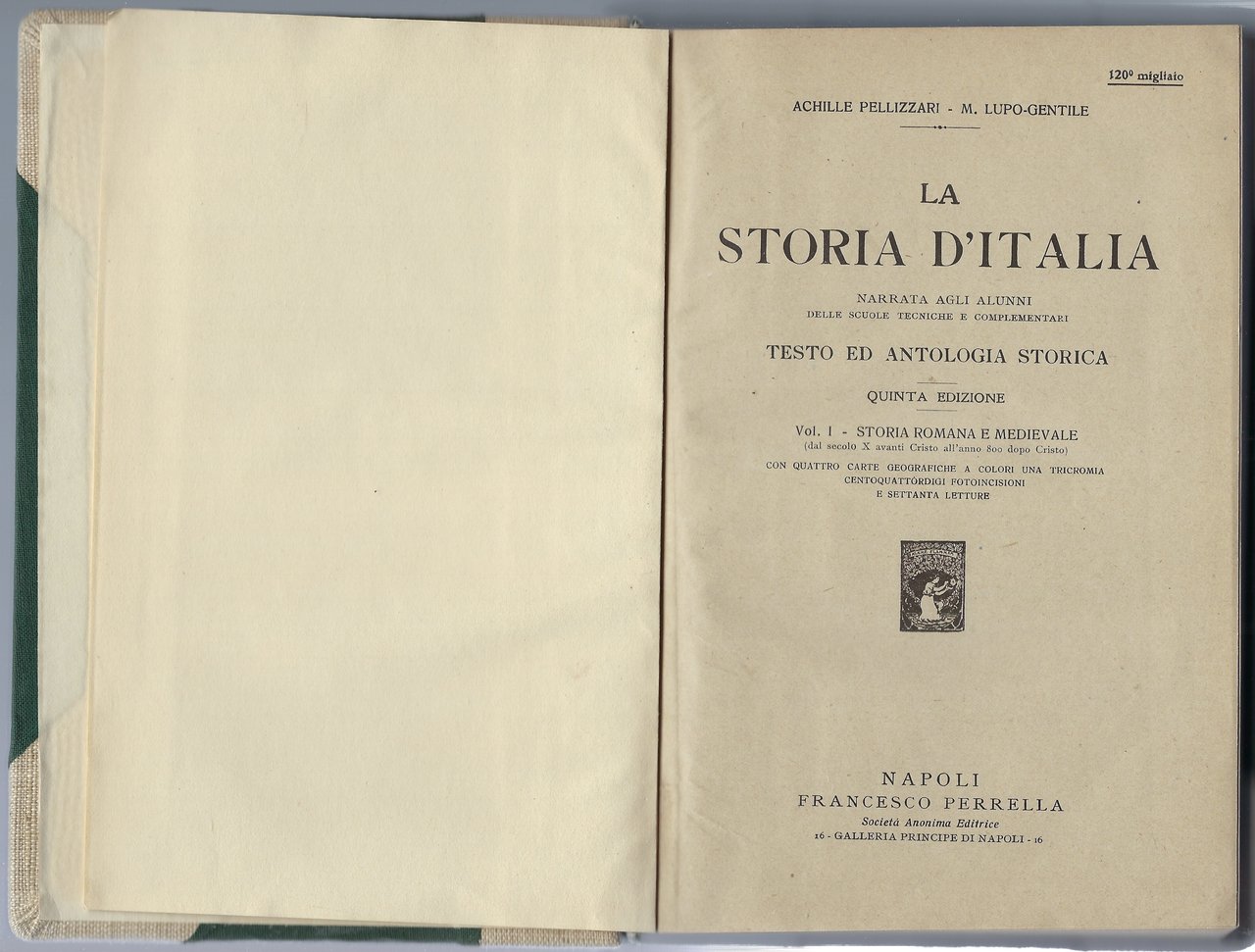 La storia d'Italia narrata agli alunni delle scuole tecniche e complementari. Testo ed antologia storica. Quinta edizione. Vol.I - Storia Romana e Medievale (dal secolo X avanti Cristo all'anno 800 dopo Cristo).