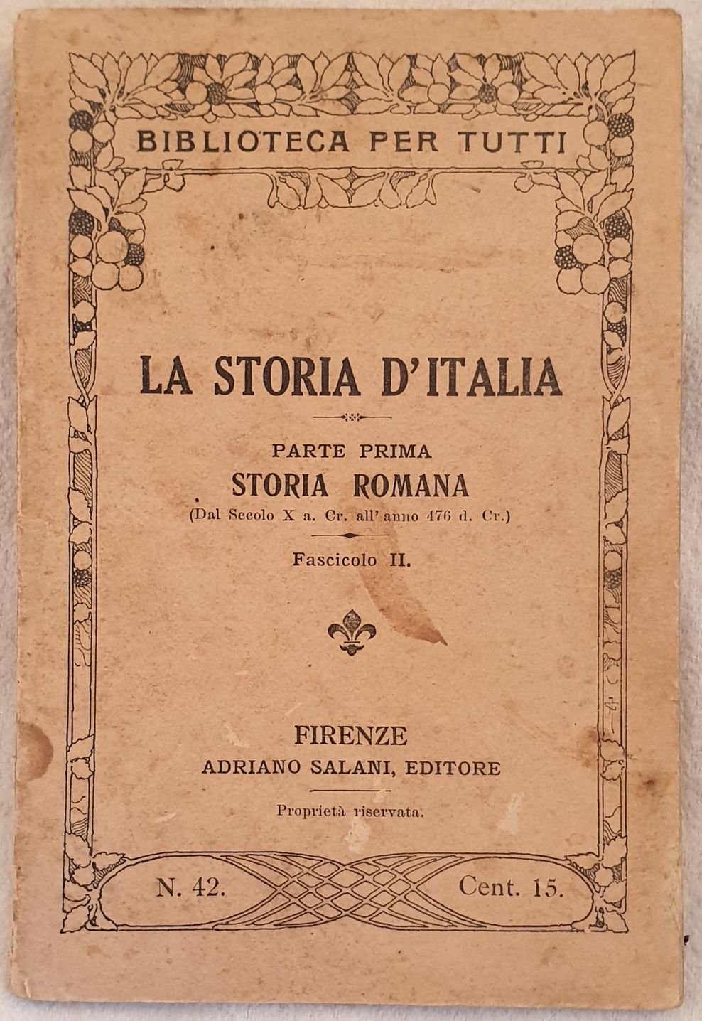 Interessante manuale di storia d'Italia del 1912 della collana "Biblioteca per tutti". Siamo in possesso della parte prima sulla storia romana che analizza dal secolo X a.c. al 476 d.c. In buone condizioni ma frontespizio mancante. Copertina editoriale in buone condizioni con lievi usure ai margini e dorso. Legatura in buone condizioni. Pagine in buone condizioni con rare fioriture. In 16. Cm 16,5x11. Pp. 72. Interesting manual of 1912 of italian history of the series "Biblioteca per tutti". Unfortunately we onyl have the first part about roman history analòyzing century from X b.c. until 476 a.c. In good conditions but title page is missing. Editorial cover in good conditions slighlty worn in the edges and spine. Binding in good conditons. Pages in good conditions with occasional foxings. In 16. Cm 16,5x11. Pp. 72.