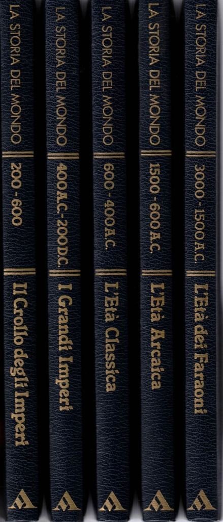 La storia del mondo, CDE-Gruppo Mondadori, s.l. (ma stampato a Verona, presso le Officine Grafiche A. Mondadori Editore) 1990, 5 voll., pp., ill. b.n. e col., cm 28, legatura in similpelle ed. con titoli in oro al dorso e titoli e ill. col. al piatto. Il lotto comprende i volumi I-V della collana La storia del mondo, edita dalla CDE-Gruppo Mondadori. Direttore responsabile Ermanno Conti. Consulenti John R. McNeill et al. Vol. I: L’età dei faraoni. 3000-1500 a.C., pp. 176 (titolo originale History of the world. The age of God-Kings, traduzione a cura di Mario Selmi). Vol. II: L’età arcaica. 1500-600 a.C., pp. 176 (titolo originale History of the world. Barbarian Tides, traduzione a cura di Mario Selmi). Vol. III: L’età classica. 600-400 a.C., pp. 174 (titolo originale History of the world. A soaring spirit, traduzione a cura di Glauco Ameri). Vol. IV: I grandi imperi. 400 a.C.-200 d.C., pp. 175 (titolo originale History of the world. Empires ascendant, traduzione a cura di Rinaldo Di Palma). Vol. V: Il crollo degli imperi. 200-600 d.C., pp. 176 (titolo originale History of the world. Empires besieged, traduzione a cura di Michele Buzzi). Minima ingiallitura della carta, per il resto perfetti.