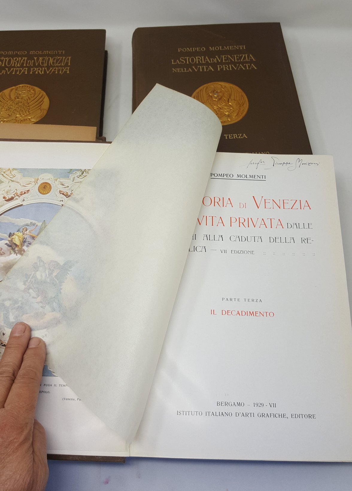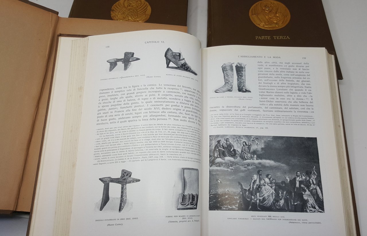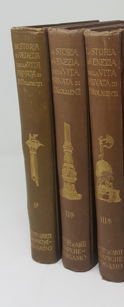 >3 vol. in-8 grande, pp. VI, (2), 563; (VI), 540; VI) 472; con molte ill. in b/n n.t. e tavole a colori f.t., carte e tavole ripieg. Bella e solida leg. edit. in piena percallina marrone, con titolo e figure in oro ai dorsi e ai piatti ant., bordura floreale a secco e tre differenti leoni di S. Marco in oro in rilievo su medaglione centrale. Elegante edizione, riccamente illustrata, a cura delI'Ist. d'Arti Grafiche di Bergamo della storia di Venezia, poderosa monografia corredata da indici in ciascun volume. I tre volumi corrispondono alle tre parti dell'opera: ''La grandezza - Lo splendore - Il decadimento''. Ottimo esemplare.