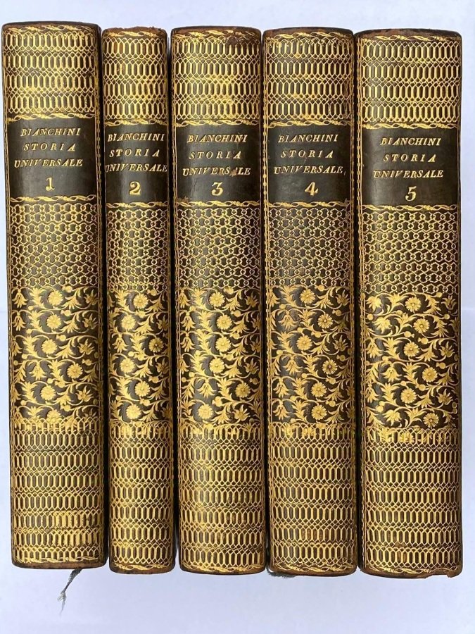 5 volumi in-8° (cm. 23,8), splendide legature coeve in mezza pelle nera con titolo e ricchissimi fregi in oro ai dorsi (piccole abrasioni alla testa e al piede di alcuni); fogli di guardia marmorizzati; carte in ottimo stato con 76 tavole illustrative fuori testo (indicate con numeri romani quelle disegnate dal Bianchini e realizzate da A. Zuliani, con numeri arabi quelle disegnate da Rizzardini e realizzate da A. Viviani, altre ancora con lettere alfabetiche), più 1 ritratto dell'autore, 1 carta geografica e 7 tavole genealogiche e cronologiche più volte ripiegate. Allegata una lettera del Battaggia agli associati. Edizione «migliore d'ogni altra» [Gamba 1798n]. Lievi e sporadiche fioriture. Ottimo esemplare. (SH2)