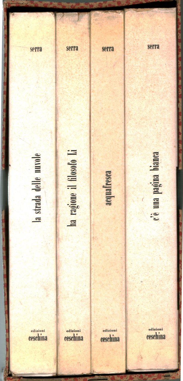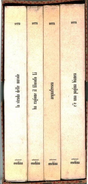 Esemplari in buone condizioni, in cofanetto con macchie di polvere e segni d'usura ai bordi e agli angoli.Sovraccoperte ingiallite al dorso, con macchie di polvere e segni d'usura all'estremità del dorso. Tagli ingialliti e con tracce di polvere.Pagine ingiallite.