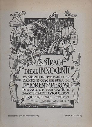 oratorio in due parti per soli e cori. Riduzione per canto e pianoforte di Luigi Cervi Timbro a secco 5/1900. P. N. 103481. Dorso rinforzato. Copertina di mataloni