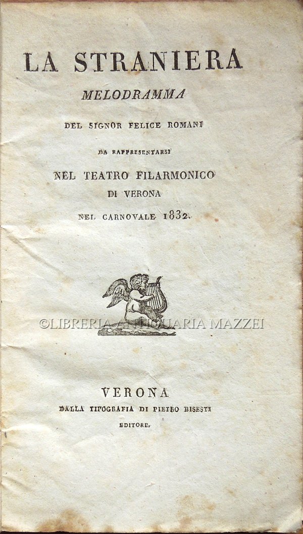 In-16° (17,3 x 10,2 cm), pp. 54, (2), copertina editoriale con titoli entro cornice. Qualche normale segno d'uso e del tempo alla copertina, in particolare, piccoli, leggeri segni d'umido e, alla prima di copertina, firma d'appartenenza e data scritte da mano coeva; vignetta al frontespizio. Pochi, lievi aloni d'umido alle pagine, leggero segno di piegatura longitudinale, per il resto ben conservato. Musica del maestro Vincenzo Bellini. La première dell'opera era andata in scena al Teatro alla Scala di Milano il 14 febbraio 1829. Personaggi: Alaide (la Straniera): Annetta Finch Lohr; Il signore di Montolino: N. N.; Isoletta, di lui figlia: Adelaide Villani; Arturo, conte di Ravenstel: Leandro Valencia; Il barone di Valdeburgo: Paolo Barroilhet; Il priore degli Spedalieri: Giuseppe Soldini; Osburgo, confidente di Arturo: Domenico Saini; Cori e Comparse: Cavalieri, Gondolieri, e Pescatori, Cacciatori, Guardie, Vassalli di Montolino. Da pagina 5: «L'azione è in Brettagna nel Castello di Montolino. L'epoca è del 1500 circa».