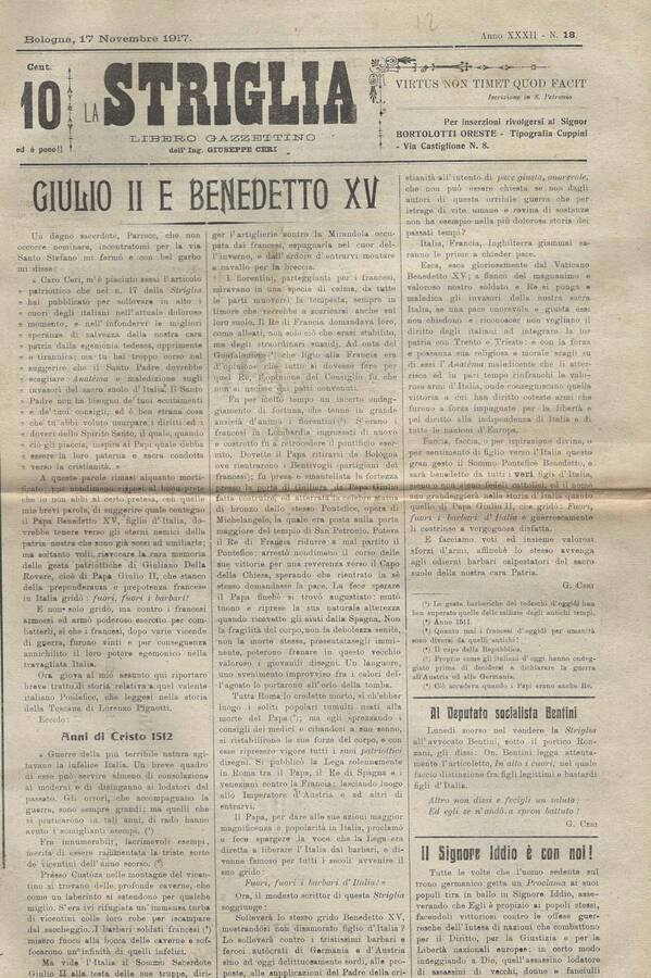 Copia Anno XXXII - N. 18 - Bologna 17 novembre 1917 - del giornale stampato per circa quarantanni, frutto per tre quarti della penna del suo fondatore e direttore ing. G. Ceri, da lui personalmente venduto, spesso offrendolo da una carrozza pubblica, noleggiata per loccasione, abbigliato con cravattina nera a farfalla e cilindro, per questo si auto definiva "giornalista giornalaio". Durante la prima guerra mondiale, Ceri continuò a produrre il suo giornale versandone il ricavato allAss. Pro Mutilati ed Invalidi di Guerra. Leggere le tracce d'uso e del tempo, pieghe di conservazione, minimi danni ai margini, illustrazioni vignette e pubblicità. Buono vista la data, l'aspetto complessivo. Numero Pagine 4