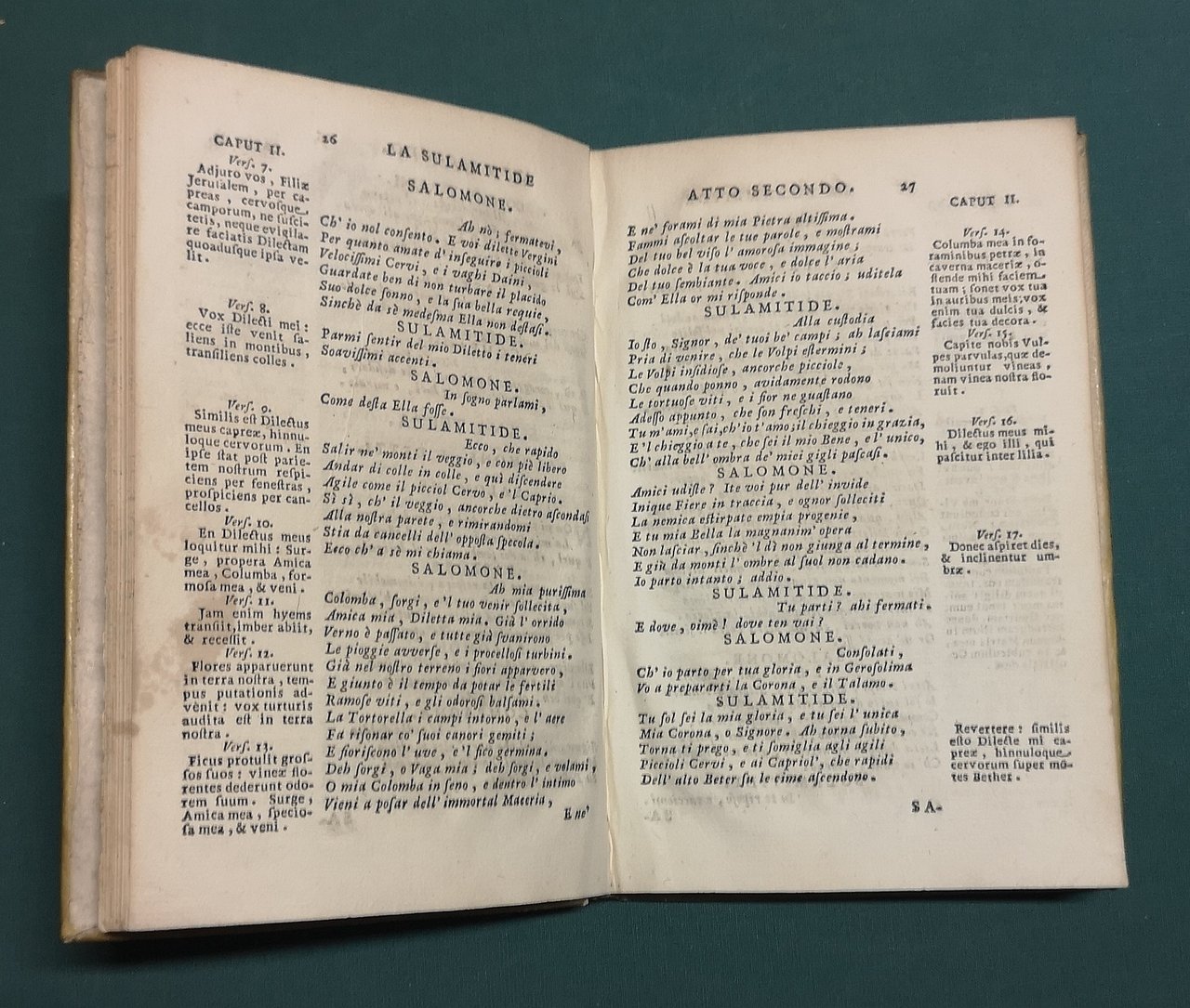 >in-8, pp. 95, (1), leg. coeva in p. perg., fregi e tit. oro al dorso. Marca sul front., testatine ed iniz. silogr. Seconda edizione (prima Roma, 1732) della rappresentazione pastorale in 5 atti in versi composta dall' arcade Neralco, pseudonimo di Giuseppe Ercolani (1672-1759), poeta, geografo, teologo, architetto e matematico. Ottimo esemp. Lancetti, Pseudonimi, 191. Soleinne 4522 ''Cette pièce assez singulière est une paraphrase continuelle du Cantique des Cantiques''. Gamba,
