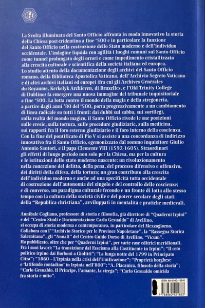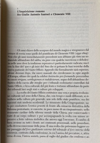 Gli anni chiave della separazione del mondo magico delle streghe dal crimen di eresia sono quelli che vanno dalla fine del '500 agli inizi del '600: anni in cui si gettano le basi teoriche della pastorale del Santo Officio. Approdo che formalmente sarà espresso, alcuni decenni dopo, dai manuali che circoleranno in ogni angolo d'Europa, segno evidente dell'abbandono definitivo della caccia alle streghe. La svolta del Santo Ufficio costituisce una vera e propria rivoluzione culturale all'interno della Chiesa che, con tempi e modi differenti, si proietta nella cultura dello Stato Pontificio e dei nascenti stati moderni. Attraverso l'uso di fonti antiche, tra cui la Instructio del 1657, l'autore analizza accuratamente le condizioni che hanno reso possibile e necessaria questa separazione: chi sono stati i protagonisti di questa svolta; quali le resistenze interne ed esterne alla Chiesa e che peso hanno avuto nel lungo e breve periodo. Indagine che va dal pontificato di Clemente VIII alla pubblicazione della Instructio.