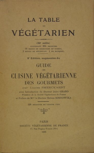 Paris, Société Végétarienne de France, 1936. Grand In-8 broché, couverture imprimée. 312 pages. 895 recettes, 96 menus de déjeuners et dîners, 2 menus de réception, 1 de banquet. Huitième édition augmentée du Guide de cuisine végétarienne des gourmets contenant 108 recettes de cuisine fine. 8è édition.