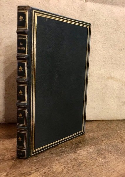 8vo (cm. 13,5), 1 c.nn. (frontespizio con ritratto xilografico entro ovale dell’Aretino), da p. 127 a p. 211. Capilettera ornati n.t. Pregevole legatura ‘800 in piena pelle con nervi, piccoli fregi, riquadri e titolo impressi in oro al ds. Dentelles e tagli dorati. Carte di guardia a pettine. Timbretto ex libris al frontespizio. Minuscoli forellini di tarlo al margine bianco delle prime ed ultime carte, altrimenti esemplare in ottimo stato di conservazione estratto dall’edizione collettiva ‘Quattro comedie del divino Pietro Aretino.’ (cfr. Allacci, 748 e Gamba, n. 1204).