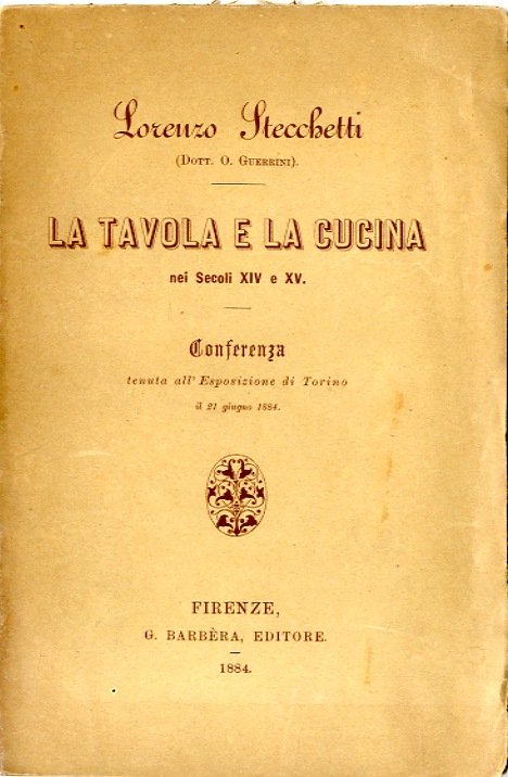 >In-8, pp. 67 brochure editoriale a stampa. La prima indagine sull'arte culinaria italiana del tardo Medioevo (1300 e 1400), con uno sguardo curioso e attento sulle abitudini alimentari, le mode e le idiosincrasie di quel tempo. Preziosa opera a cura del critico letterario e poeta Olindo Guerrini (1845-1916), alias Lorenzo Stecchetti. Piccola integrazione al dorso ma ottimo stato. Edizione originale. Non comune.
