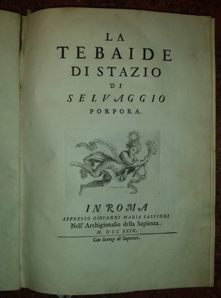 In-4 (29 cm) (4) 500 (invece 490) (2). Al frontespizio vignetta calcografica. 12 testatine, capolettera e finalini calcografici (all'inizio e alla fine di ogni libro). Prima edizione. Piena pelle coeva, contropiatti rivestiti di carta, tagli spruzzati di rosso. Fregi dorati al dorso. Ex-libris Bibliotheca Ioannis Baptistae Recanati 1718. Bellissimo esemplare, fresco e a pieni margini. Leggera usura ai piatti. Menda alla cuffia superiore. Il Cardinale Cornelio Bentivoglio (1668-1732) con lo pseudonimo di Selvaggio Porpora, pubblicò in Roma nel 1729 la sua famosa traduzione in versi sciolti della Tebaide di Stazio; la stessa venne più volte ristampata in quanto considerata come il quarto dei nostri maggiori volgarizzamenti. Gamba testi di lingua 2454: "Magnifica edizione che meritò d'essere lodata da Mons. Fontanini e dal suo annotatore Apostolo Zeno, il quale trovava la versione del Bentivoglio "in bellissimi sciolti italiani, sublime senza gonfiezza, grande senza sproporzione, soave senza mollezza." (EN) In-4 (29 cm) (4) 500 (instead of 490) (2). Engraving vignette on the title page. 12 headers, drop caps and intaglio caps (at the beginning and end of each book). First edition. Contemporary full leather, paper-covered backing plates, cuts sprayed with red. Golden friezes on the back. Ex-libris Bibliotheca Ioannis Baptistae Recanati 1718. Beautiful copy, fresh and with full margins. Light wear on the plates. Menda to the upper cap. Cardinal Cornelio Bentivoglio (1668-1732) under the pseudonym Selvaggio Porpora, published his famous translation into blank verse of Statius' Thebaid in Rome in 1729; the same was reprinted several times as it was considered the fourth of our major popularizations. Gamba testi di lingua 2454: "Magnificent edition that deserved to be praised by Mons. Fontanini and his annotator Apostolo Zeno, who found Bentivoglio's version "in beautiful Italian looses, sublime without bloat, large without disproportion, sweet without softness."