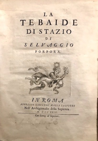 4to (cm. 29,5), 2 cc.nn., 500 pp., 1 c.nn. Vignetta al frontespizio, testatine, capilettera e finalini calcografici. Legatura coeva in piena pelle con nervi e ricchi fregi impressi in oro al ds. (lievi abrasioni e mancanze della doratura al dorso). Tagli colorati a spruzzo. Ex libris di collezione privata al contropiatto anteriore. Esemplare in eccellente stato di conservazione. Elegante prima edizione della traduzione in italiano ad opera del cardinale Cornelio Bentivoglio sotto lo pseudonimo di Selvaggio Porpora. Gamba (n. 2454): ‘Magnifica edizione che meritò d’essere lodata da monsign. Fontanini, e dal suo annotatore Apostolo Zeno, il quale trovava la versione del Bentivoglio, in bellissimi sciolti italiani, sublime senza gonfiezza, grande senza sproporzione, soave senza mollezza’.