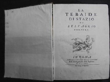 ROMA, APPRESSO GIOVANNI MARIA SALVIONI, 1729. In 4∞: pp. 2nn + 500 + 2nn. Bella vignetta incisa al front. con lievi mende, testatine, capolettera e finalini all`inzio e alla fine di ogni libro. Mende alle sguardie incollate, tagli spruzzati in rosso. Leg. in pelle usurata, dorso a cinque scomparti con tit. dorato al dorso con ricchi fregi, piccoli fori di tarli al dorso. Lievi tracce di vecchia umidit‡. "Publio Papinio Stazio (Napoli 45/96 d.C.), tradotto dal cardinale Cornelio Bentivoglio (1668-1732) con lo pseudonimo di Selvaggio Porpora, poeta latino, uno dei principali esponenti della poesia epica dell`et‡ flavia, assieme a Silio Italico e Valerio Flacco conosciuto per essere l`autore di due poemi epici, la Tebaide, opera in XII libri che narra la guerra dei sette contro Tebe e la lotta dei fratelli Eteocle e Polinice e l`Archilleide, opera rimasta incompiuta al II libro (la giovinezza del Pelide) sulla vita e le gesta di Achille, autore di una raccolta di 32 componimenti, le Silvae. E` anche noto per la sua presenza nella Divina Commedia di Dante Alighieri, dove svolge la funzione di guida del Purgatorio" (cfr.Gamba testi di lingua 2454).