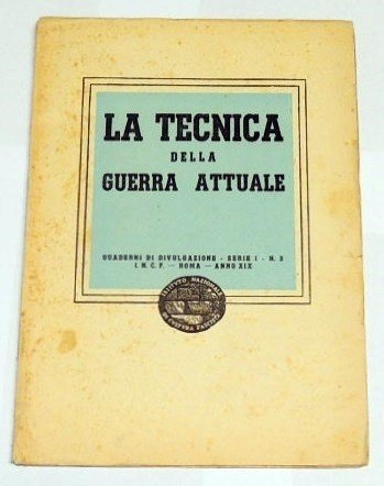 La tecnica della guerra attuale, Istituto Nazionale di Cultura Fascista, Roma 1941, pp. 47, cm 23, br. ed. Collana Quaderni di Divulgazione, serie I, n. 3. Supplemento a Civiltà fascista, n. 9, settembre 1941. Segni del tempo, ma per il resto buon esemplare, intonso.