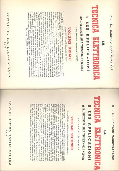 DUE VOLUMI IN 8. VOL.1°), pp.XXXII, 705, CON 558 ILLUSTRAZIONI E XXIII TABELLE. VOL.2°), <BR>pp.XXXII, 820, CON 601 ILLUSTRAZIONI, DELLE QUALI 3 f.t., e XVII TABELLE. TERZA EDIZIONE INTERAMENTE RIFUSA, NON PIU' COSTITUITA DA DUE TOMI, MA DA DUE DISTINTI VOLUMI, AVENTI CIASCUNO UNA SUA PARTICOLARE CARATTERISTICA. IL VOL.I TRATTA LE NOZIONI BASILARI DELL'ELETTRONICA RIVEDUTE E AGGIORNATE SECONDO I PRINCIPI DELLE MODERNE TEORIE DELLA FISICA ATOMICA E DELLE IPERFREQUENZE. IL VOL.II TRATTA LE PIU' IMPORTANTI E PIU' DIFFUSE APPLICAZIONI DELL'ELETTRONICA: DAGLI AMPLIFICATORI, ANCHE A LARGA BANDA, AI TRASMETTITORI E RICEVITORI MA, MF E PER MICROONDE; DAI SISTEMI AD IMPULSI ALLA TELEVISIONE; DAI RADAR AI PONTI RADIO, ECC. RILEGATURE D'EPOCA IN MEZZA PELLE A QUATTRO NERVI CON TITOLO IN ORO, PIATTI TELATI, ANGOLI IN PELLE. OTTIMA CONSERVAZIONE.