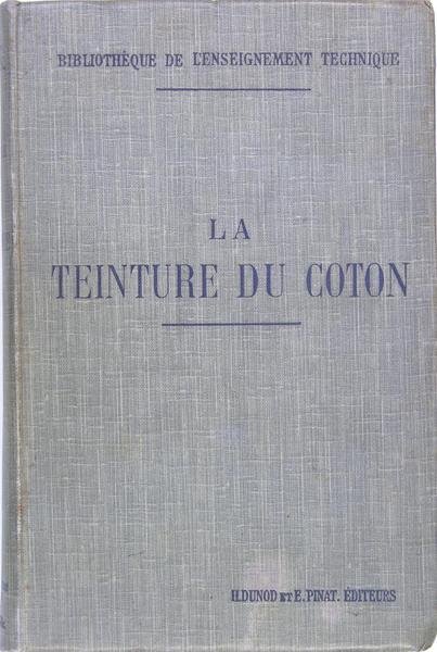 Paris, H. Dunod et Pinat éditeurs, 1912. In/8 reliure éditeur toile, titre en noir sur le plat, planches avec 72 échantillons de coton teints, 57 figures, 291 pags, 4 f. L’eau et les produits utilisés en teinture, la teinture du coton, couleurs végétales, colorants substantifs, méthodes de fixage, couleurs immédiates, colorants basiques, couleurs d’alizarine, d’indanthrène, apprêts, impression, couleurs artificielles,
