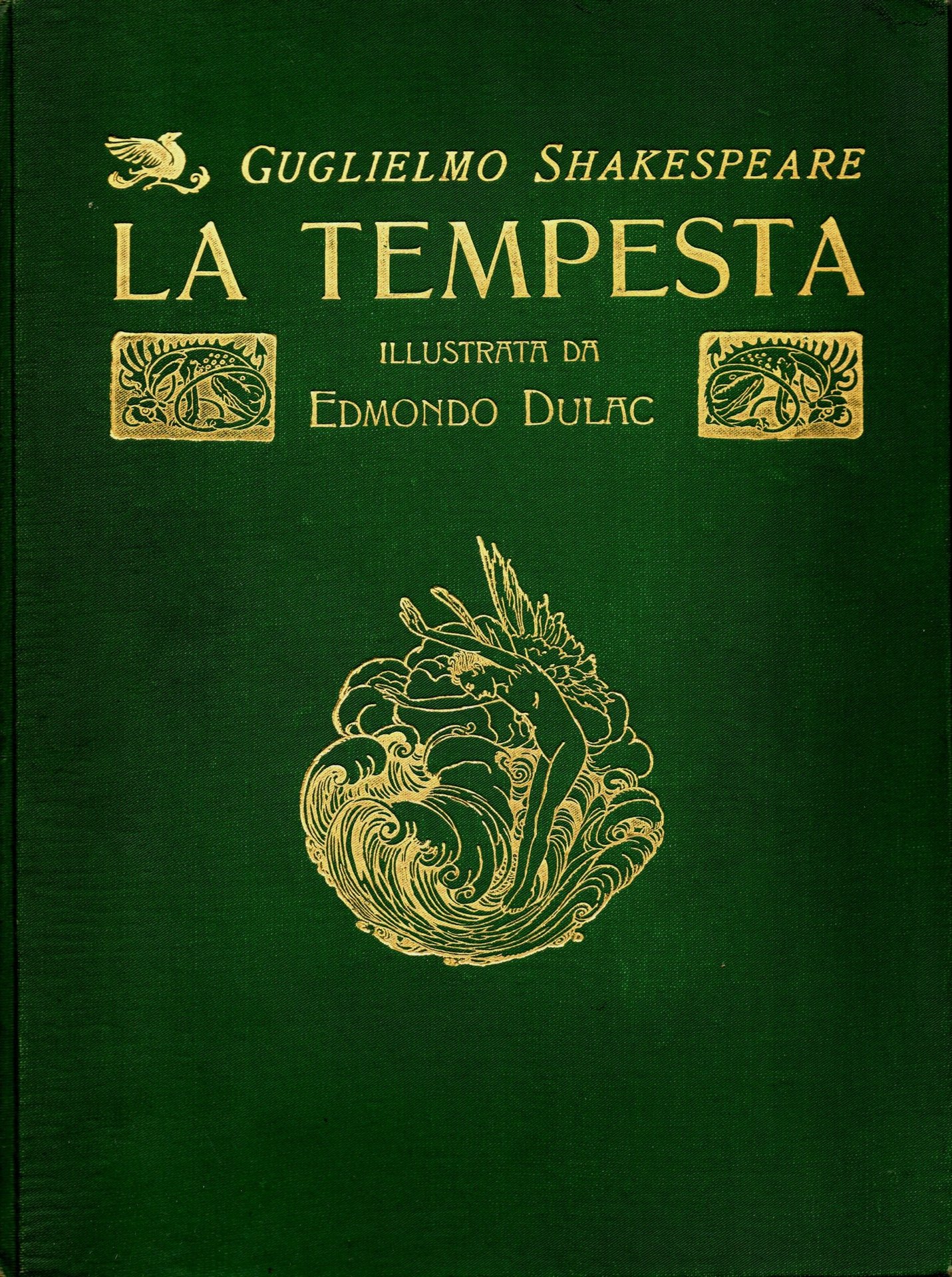Legatura editoriale in piena tela verde, titoli in oro al piatto e al dorso, taglio superiore dorato, risguardi in carta decorata, la data di pubblicazione si deduce dall'OPAC, traduzione di Diego Angeli, illustrazioni in b/n nel testo, 40 tavole applicate fuori testo riproducono a colori le bellissime illustrazioni di Edmund Dulac (1882-1953), ciascuna protetta da carta velina con impresso il titolo, ex libris applicato al risguardo anteriore e alla prima carta bianca. Piatto anteriore leggermente allentato, altrimenti esemplare con carte pulite in ottimo stato.