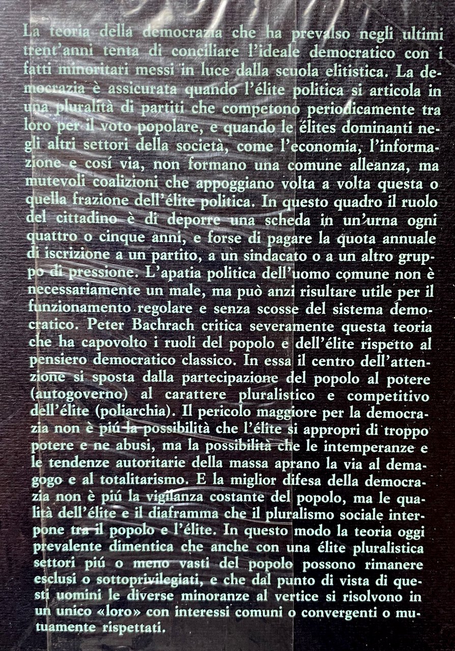 Soggetti: Politica, Scienze politiche, Teorie, Filosofia, Democrazia partecipativa, Potere, Lotta di classe, Poliarchia, Costituzione, Rappresentanza, Stato, Classi sociali superiori, Aristocrazia, Elezioni, Critica, Interpretazione, Saggi politici, Libri rari introvabili Vintage fuori catalogo, Bibliografia, Riferimento, Collezionismo, Consultazione, Libertà, Totalitarismo, Dittatura, Controllo, Parlamento, Diritto costituzionale, Demagogia, Pluralismo, Popolo, Inclusione, Esclusione, Minoranze, Alleanze, Partiti politici, Voti, Elezioni, Rappresentanti, Gruppi di pressione, America, Lobby, Interessi, Forme di governo, Leggi, Autoritarismo, Coalizioni, Programmi, Divario, Mass Media, Propaganda, Scelta, Povertà, Pratica, Partecipazione, Cittadini, Azione, Separazione dei poteri, Processo, Sistema politico, Poveri, Robert Dahl, Ridistribuzione, Mobilitazione, Urne, Carta dei diritti, Magistratura, Neri americani, Proletariato, Legislazione, Giustizia, Censo, John Stuart Mill, Joseph Schumpeter, Lane Davis, V. O. Key, Violenza, Voto, Wright Mills, Liberalismo, Liberaldemocrazia, Destra, Sinistra, Opinione pubblica, Lippmann, Lipset, Paul Goodman, Elettori, Maggioranza, Mezzi, Comunicazione, Massa, Negri, Nonélites, Organizzazione, Radicalismo, Responsabilità, Regole, Harold Lasswell, Decentramento, David Truman, Norberto Bobbio, Danilo Zolo, Elettorato, Economia, Risorse, Finanziaria, Istituzioni, Influenza, Teoria democratica, Ideologia, Ideologie, Società, Movimenti, Opposizione, Consenso, Dissenso, Rivoluzione, Conflitti sociali, Conflitto, Comportamento, Falsa coscienza, Gruppi governativi, Leadership, Struttura, Pratica, Tolleranza, Radicalismo, Robert Michels, Gaetano Mosca, Vilfredo Pareto, Wilson, Marx, Engels, Lenin, Marxismo, Jefferson, Lincoln, Jack L. Walker, Angus Campbell, Consiglio, Processo decisionale, Attivisti, Attivismo, Intolleranza, Limiti, Problemi, Requisiti, Norme, Stati Uniti, Anni Settanta, Europa, Germania, Svezia, Francia, Italia, Inghilterra, Aryeh Botwinick, Capitale, Capitalismo, Pochi, Anni Sessanta, Anti-elitisti, Eligere, Scegliere, Scelta, Preferenze, Monopolio, Comunismo, Socialismo, Bernard Crick, Louis Hartz, G. D. H. Cole, Raymond Aron, John Plamenatz, Sheldon Wolin, Sociologia, Scienze sociali, Ruoli, Kornhauser, Uguaglianza, Equilibrio, Concetti, Studi, Berle, Uomo comune, Unione Sovietica, Stalin, Mussolini, Hitler, Common law, Corporazioni, Negroes, Aristotele, Montesquieu, Bipartizione, Machiavelli, Max Weber, Herrschaft, Anarchismo, Oligarchia, Darwinismo, Guido Dorso, Filippo Burzio, Thomas Hobbes, Leviatano, Weimar, Giovanni Sartori, Rousseau, Egualitarismo, T.B. Bottomore, James Burnham, The Machiavellians, Macht und Armut. Eine theoretisch-empirische Untersuchung, Politics, Political Science, Theories, Philosophy, Participatory Democracy, Power, Class Struggle, Polyarchy, Constitution, Representation, State, Upper Social Classes, Aristocracy, Elections, Criticism, Interpretation, Political Essays, Rare Books Out of Print, Bibliography, Reference, Collecting, Consultation, Freedom, Totalitarianism, Dictatorship, Control, Parliament, Constitutional law, Demagoguery, Pluralism, People, Inclusion, Exclusion, Minorities, Alliances, Political parties, Votes, Elections, Representatives, Pressure groups, Interests, Forms Government, Laws, Authoritarianism, Coalitions, Programs, Gap, Choice, Poverty, Practice, Participation, Citizens, Action, Separation of Powers, Process, Political System, Poor, Redistribution, Mobilization, Ballot Boxes, Bill of Rights, Judiciary, Black Americans, Proletariat, Legislation, Justice, Wealth, Violence, Voting, Liberalism, Liberal Democracy, Right, Left, Public opinion, Voters, Majority, Media, Communication, Organization, Radicalism, Responsibility, Rules, Decentralization, Electorate, Economy, Resources, Financial, Institutions, Influence, Democratic theory, Ideology, Ideologies, Society, Movements, Opposition, Consensus, Dissent, Revolution, Social conflicts, Conflict, Behavior, False consciousness, Government groups, Structure, Practice, Tolerance, Radicalism, Marxism, Council, Decision making , Activists, Activism, Intolerance, Limits, Problems, Requirements, Norms, United States, Seventies, Europe, Germany, Sweden, France, Italy, England, Capitalism, Few, Sixties, Anti-elitists, Elect, Choose, Choice, Preferences, Monopoly, Communism, Sociology, Social sciences, Roles, Equality, Balance, Concepts, Studies, Common man, Soviet Union, Corporations, Aristotle, Bipartition, Anarchism, Oligarchy, Leviathan, Egalitarianism